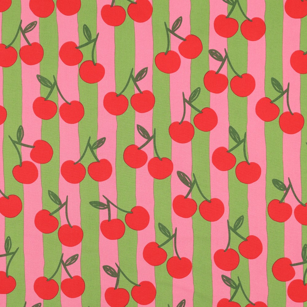 Äpplen och körsbär, och ränder, här i en serie som garanterat sätter ett leende på läpparna. De klara, glada färgerna piggar upp både sinnet och en gråmulen dag. De lite lätt oregelbundna ränderna är ca 2cm breda och äpplena är runt 4cm höga. En extra härlig bomullspoplin (=tätvävd). Tänk dig en skjorta eller en klänning eller en kudde eller en duk eller en gardin eller…Allt!