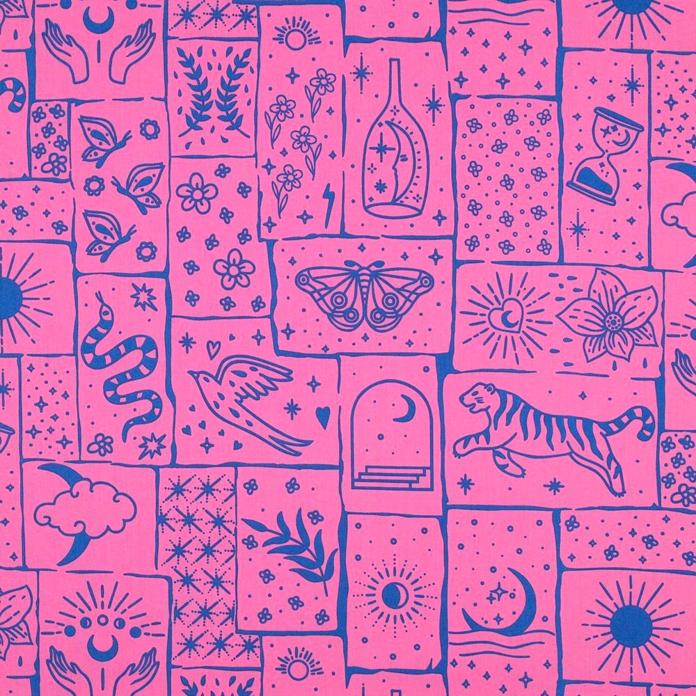 Lyxig kvalité med härliga färger, som verkligen skruvar upp livsglädjen. I den här snudd på magiska mönstervärlden får du möta tigrar, månar, ormar och blommor. Största rutan är ca 11cm hög. En härlig bomullspoplin (=tätvävd). Tänk dig en stram skjorta eller en A-linje klänning eller en kudde eller en duk eller en gardin eller en duk eller…Allt!