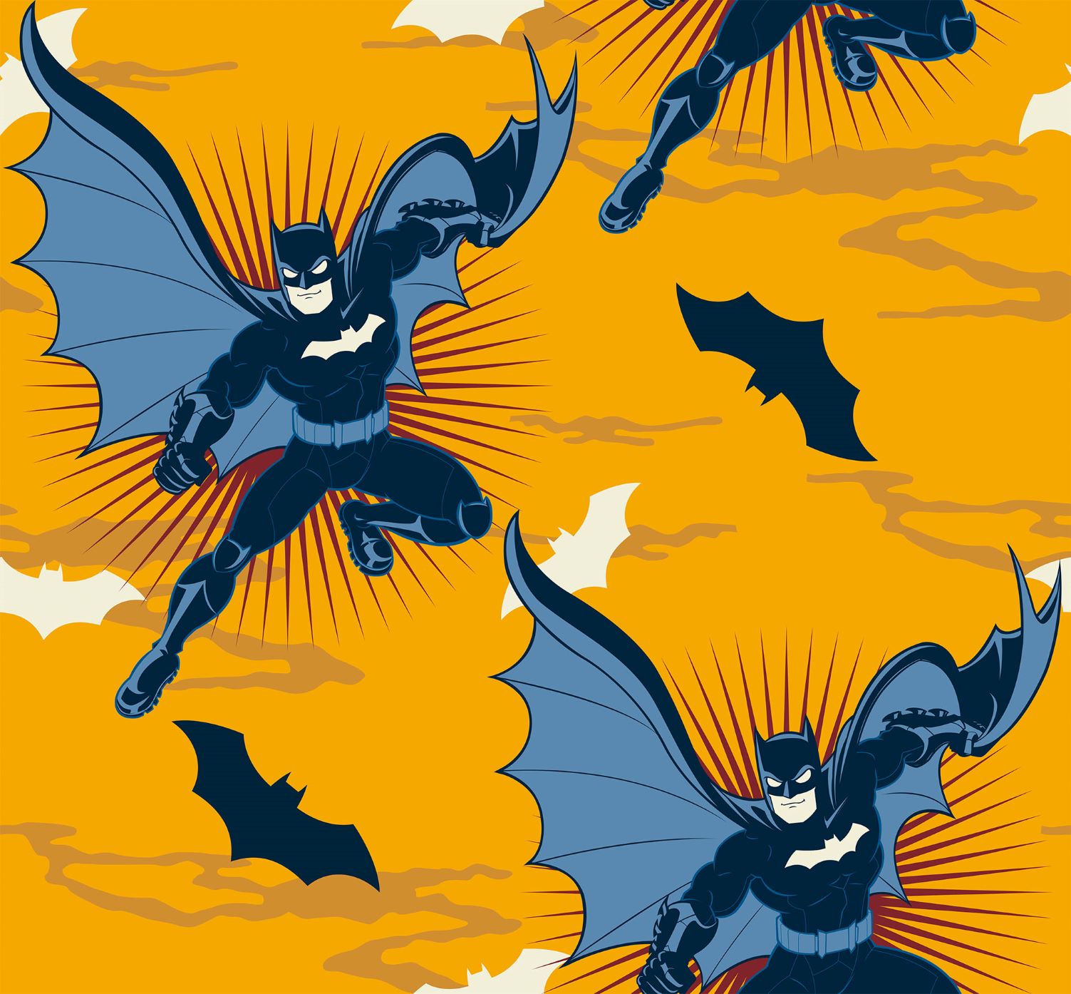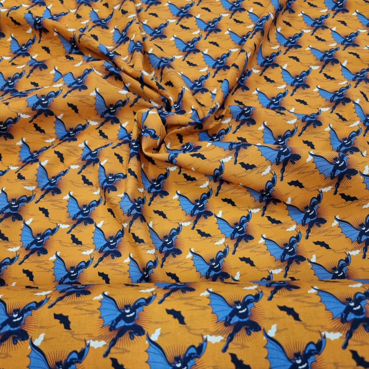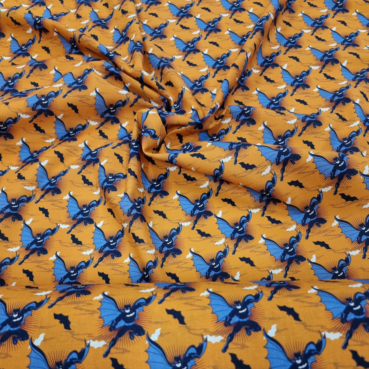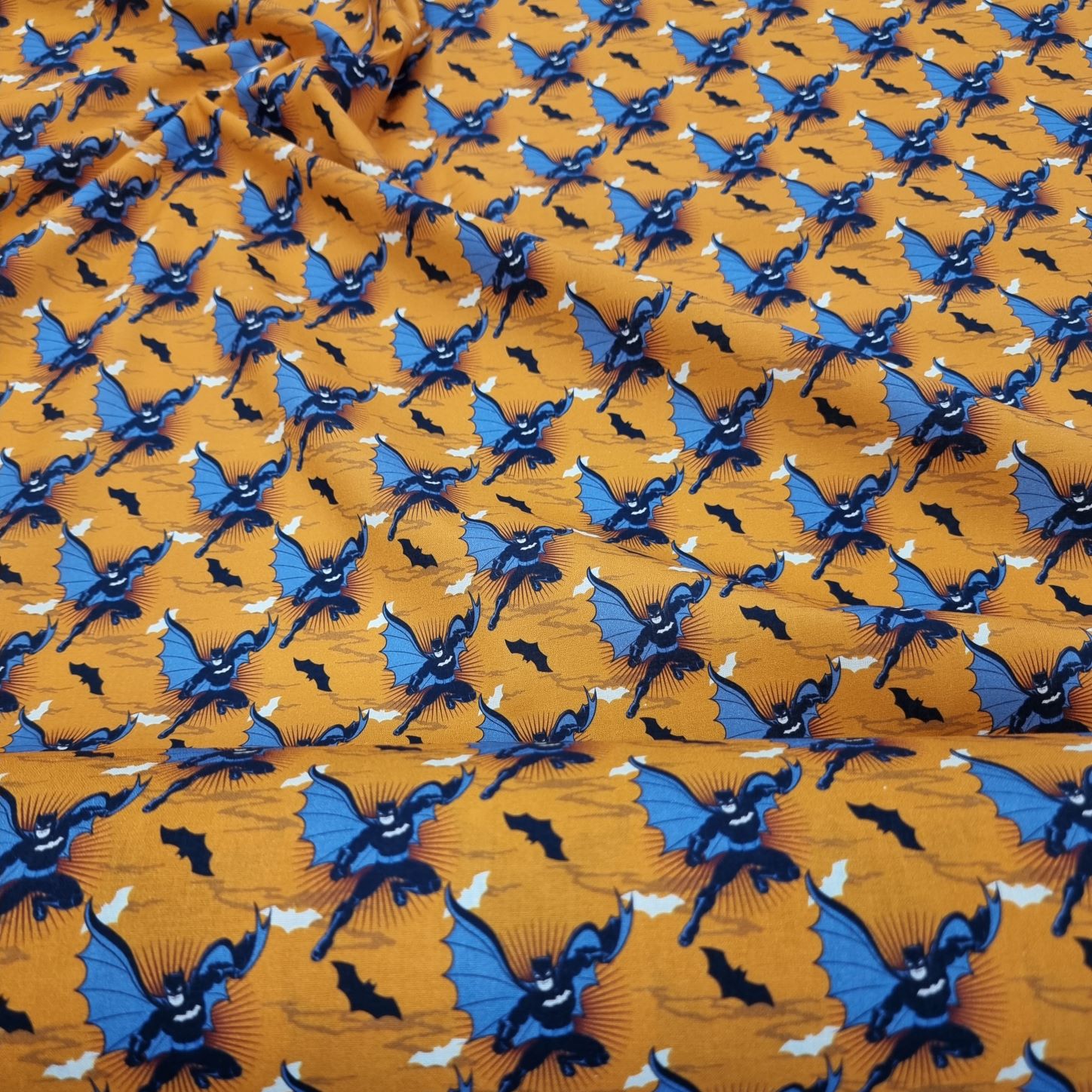 Batman från Warner Bros i en bomullspoplin (=tätvävd). Gör sig lika bra i klänningen, som i babynestet, som i skjortan, som i kjolen, som i gardinen, som i örngottet, som i, ja, du förstår, den passar till lite utav varje.