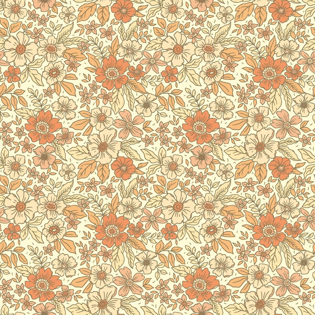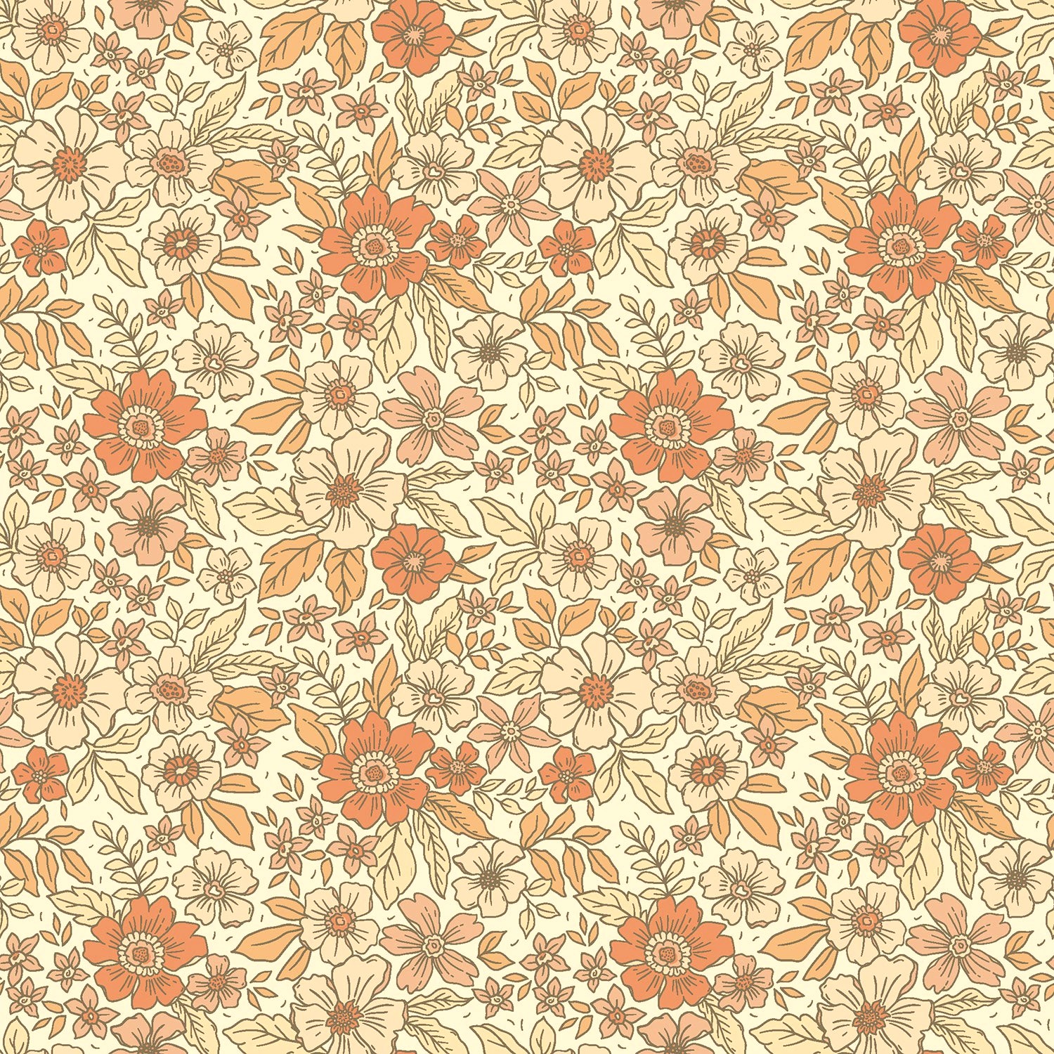Söta små blommor i varma beige toner på en svagt ljusgråbeige botten. Som en blomsteräng i lugna färger. Den största blomman är ca 2,5 cm.