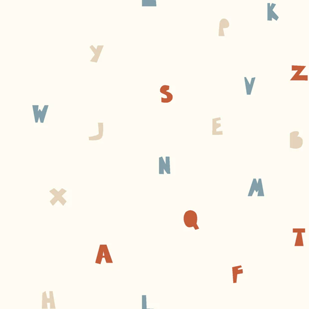 Här ligger de ca 1cm höga bokstäverna lite utströsslade. Färgerna är milda men fylliga och visst blir man sugen på att klura ut vilka ord det kan bli? Gör sig lika bra i babynestet, som i skjortan, som i kjolen, som i gardinen, som i örngottet, som i, ja, du förstår, den passar till lite utav varje.