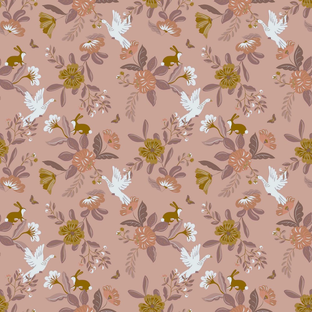 Mjuka toner och fylliga pasteller. Blommande trädgård, smygande harar och blomdoftande exotiska fåglar. Trevligt! Fjärilen är ca 1cm. En härlig bomullspoplin (=tätvävd). Gör sig lika bra i babynestet, som i skjortan, som i kjolen, som i gardinen, som i örngottet, som i, ja, du förstår, den passar till lite utav varje.
