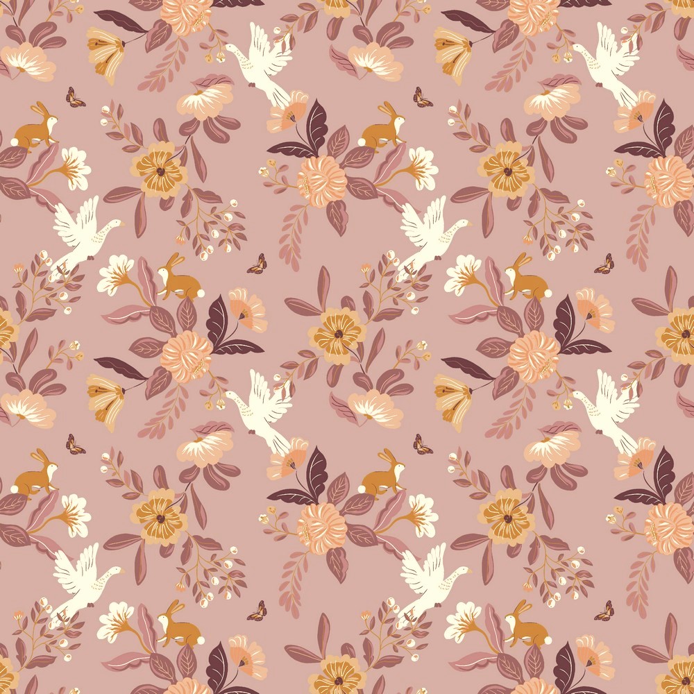 Mjuka toner och fylliga pasteller. Blommande trädgård, smygande harar och blomdoftande exotiska fåglar. Trevligt! Fjärilen är ca 1cm. En härlig bomullspoplin (=tätvävd). Gör sig lika bra i babynestet, som i skjortan, som i kjolen, som i gardinen, som i örngottet, som i, ja, du förstår, den passar till lite utav varje.