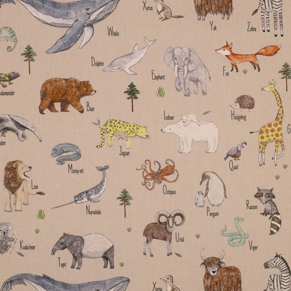 Här har samlats en väldans massa olika djur både från havets djup i form av valar och delfiner, och djur från stepperna i form av elefanter och myrslokar. Vilket djur är favoriten? Koalan är ca 4cm hög. En härlig digitaltryckt bomullspoplin (=tätvävd). Gör sig lika bra i babynestet, som i skjortan, som i kjolen, som i gardinen, som i örngottet, som i, ja, du förstår, den passar till lite utav varje.
