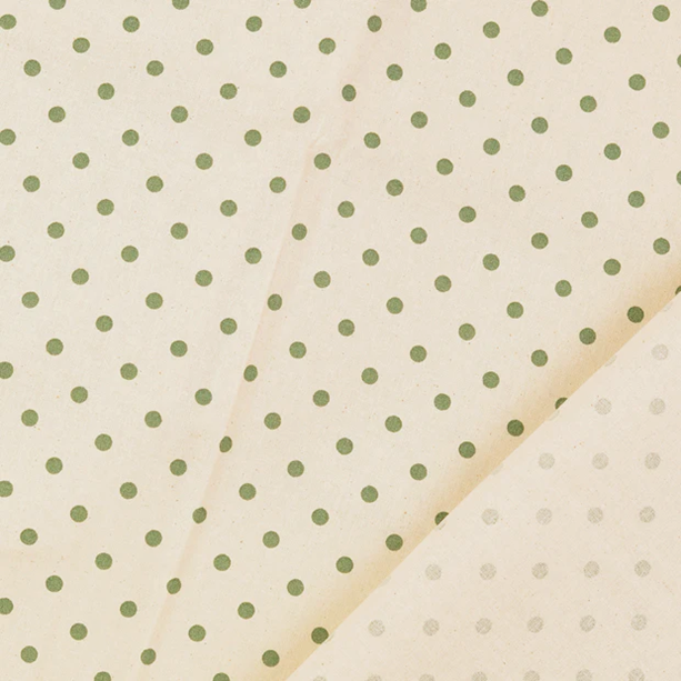 En högkvalitativ (cretonne) och härlig bomullsväv med klassiska prickar på en fröskalsbotten. Pricken är 6mm. Det som gör det här trycket lite speciellt är att det är en sk wash out dvs. det får en lite sliten vintage-look efter tvätt. Gör sig lika bra i skjortan, kjolen, gardinen, örngottet, duken, ja, du förstår, den passar till lite utav varje.
