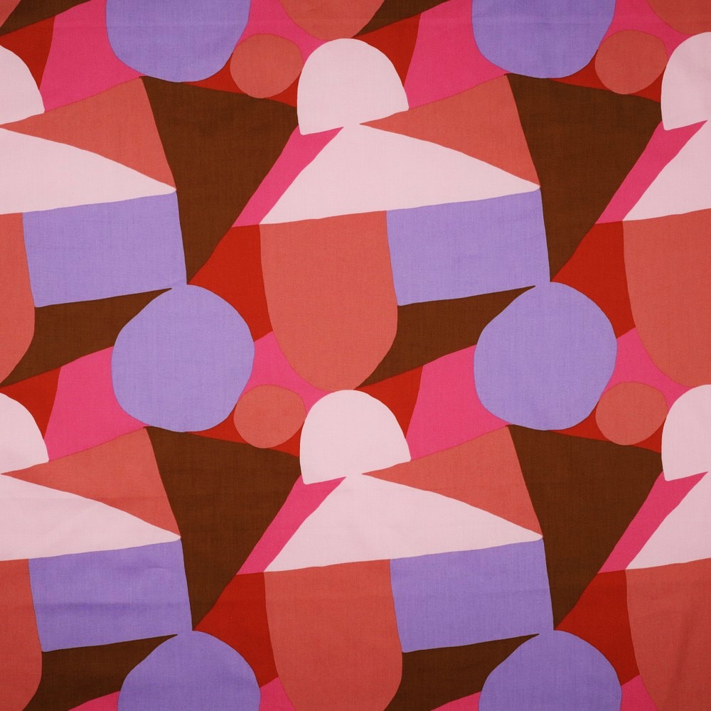 Enkla grafiska former i härliga färger. Inte det minsta tråkigt. Nerida Hansen som designat detta tyg lämnar en med en önskan om att få ser mer av hennes alster. Minsta pricken är ca 5cm. En härlig bomullspoplin (=tätvävd). Tänk dig en stram skjorta eller en A-linje klänning eller en kudde eller en duk eller en gardin eller en duk eller…Allt!
