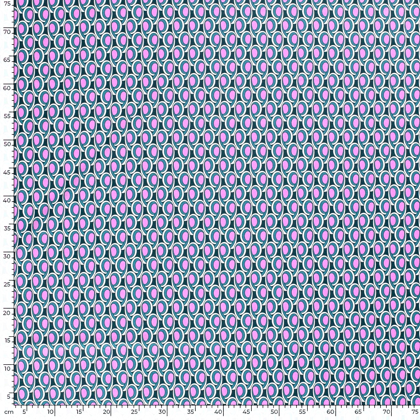 En mjuk och behaglig bomullsväv vars mönster och färger tydligt flörtar med retrokänslan. Är det 60-tal eller 70-tal? Är det en nia eller ett kommatecken? Krumeluren är i alla fall 4cm hög. Gör sig lika bra i babynestet, som i skjortan, som i kjolen, som i gardinen, som i örngottet, som i, ja, du förstår, den passar till lite utav varje. Glömde shopingkassen!