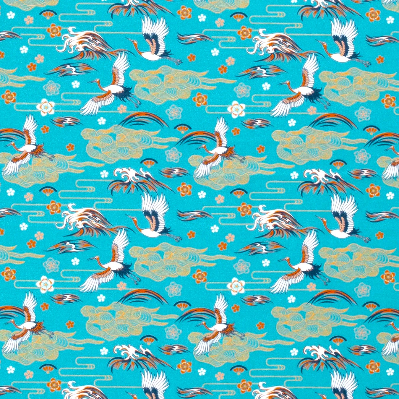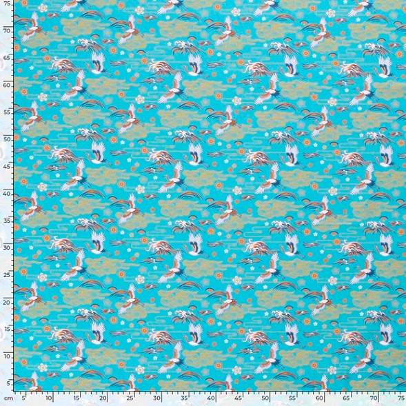 Färgerna, mönstret; allt med denna bomullspoplin får det att kännas som en episk saga. Största tranan har ca 7cm mellan vingspetsarna. Gör sig lika bra i kimonon, som i skjortan, som i kjolen, som i gardinen, som i örngottet, som i, ja, du förstår, den passar till lite utav varje.