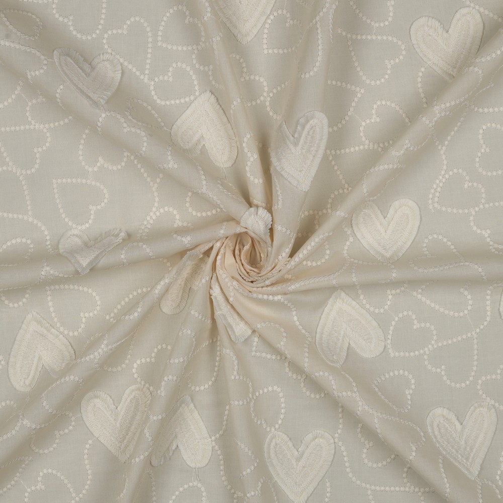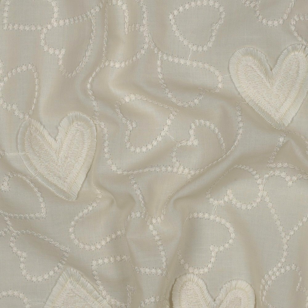 Här har du ett perfekt tyg för ärmar med mycket vidd. Det är tunt, lätt och skirt, och har hjärtan på tråd broderade över hela bredden. De största hjärtana som är knappt 5 cm stora har dessutom fransar runt ytterkanten.