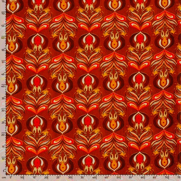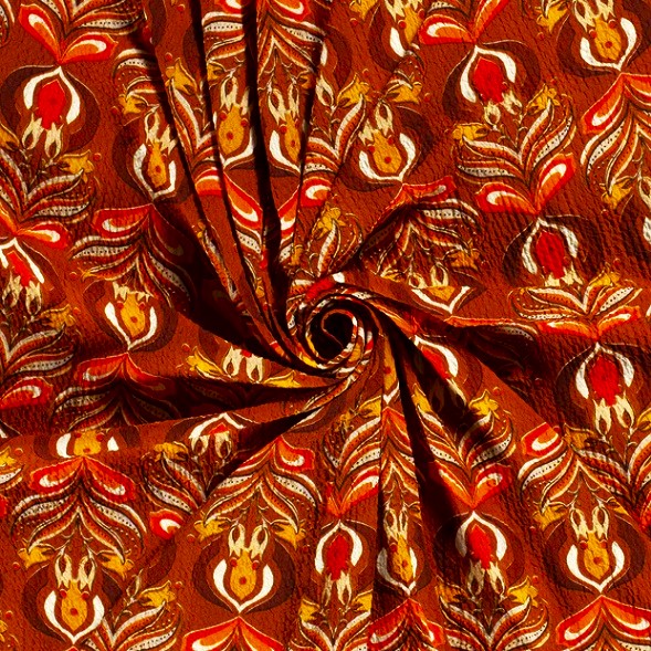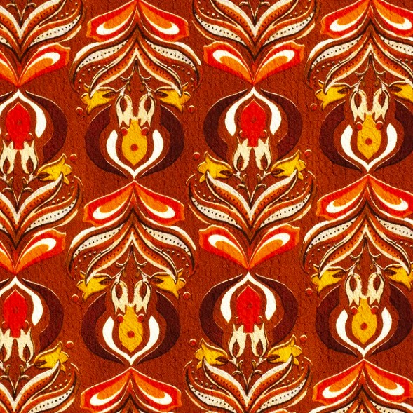 Här var det retro så det bara skriker om det. Som ett kurbitsmönster som svalt 70-tals paletten. Den bubbliga strukturen kommer sig av att det är en bäckochbölja. Tänk dig blusen, vida byxan, byxdressen, kaftanen, långskjortan, klänningen etc.[/vc_column_text][/vc_column][/vc_row]