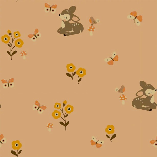 Här har du svampar, rådjur och blommor i mysiga färger; med andra ord rätt fint. Rådjuret är ca 4cm brett. Ett trikåtyg i en typisk tights/t-shirt-kvalité, med en stretch som gör att det lämpar sig både till tightare och lösare plagg. Det är mjukt, följsamt och framförallt väldigt bekvämt.