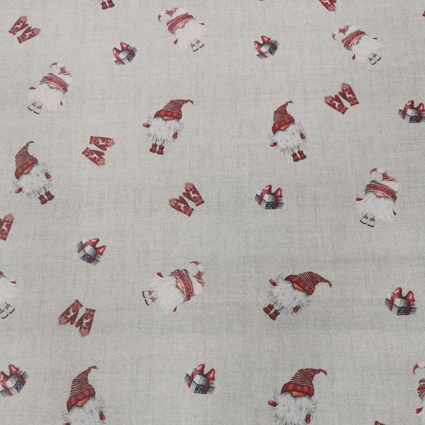 Dags att fixa till hemmet inför jul. Tomtar tryckta på en halvkraftig väv, lämplig till kuddar, gardiner, dukar, pyssel eller varför inte rentav till att klä in dina mest spektakulära klappar i tyg.
