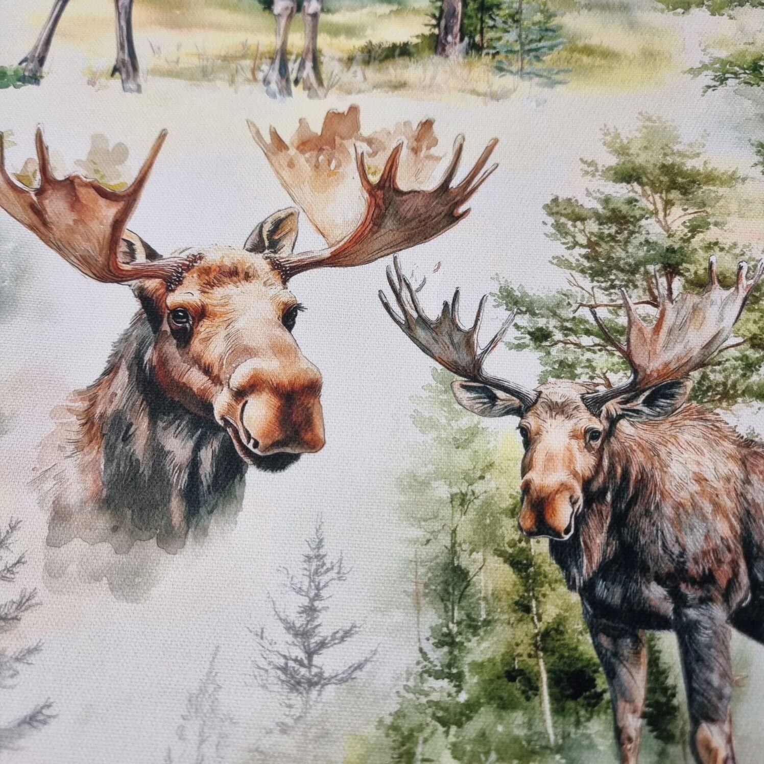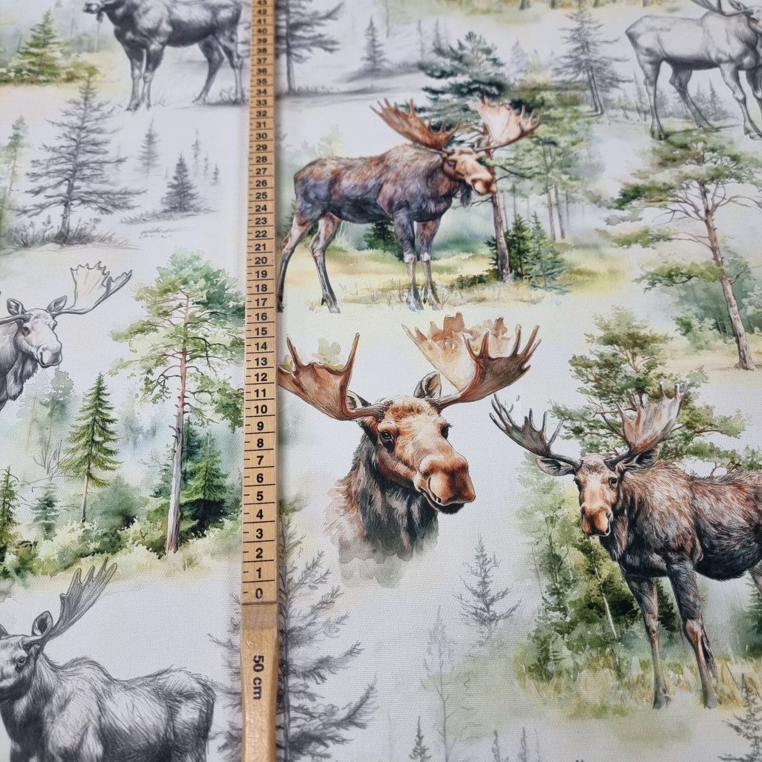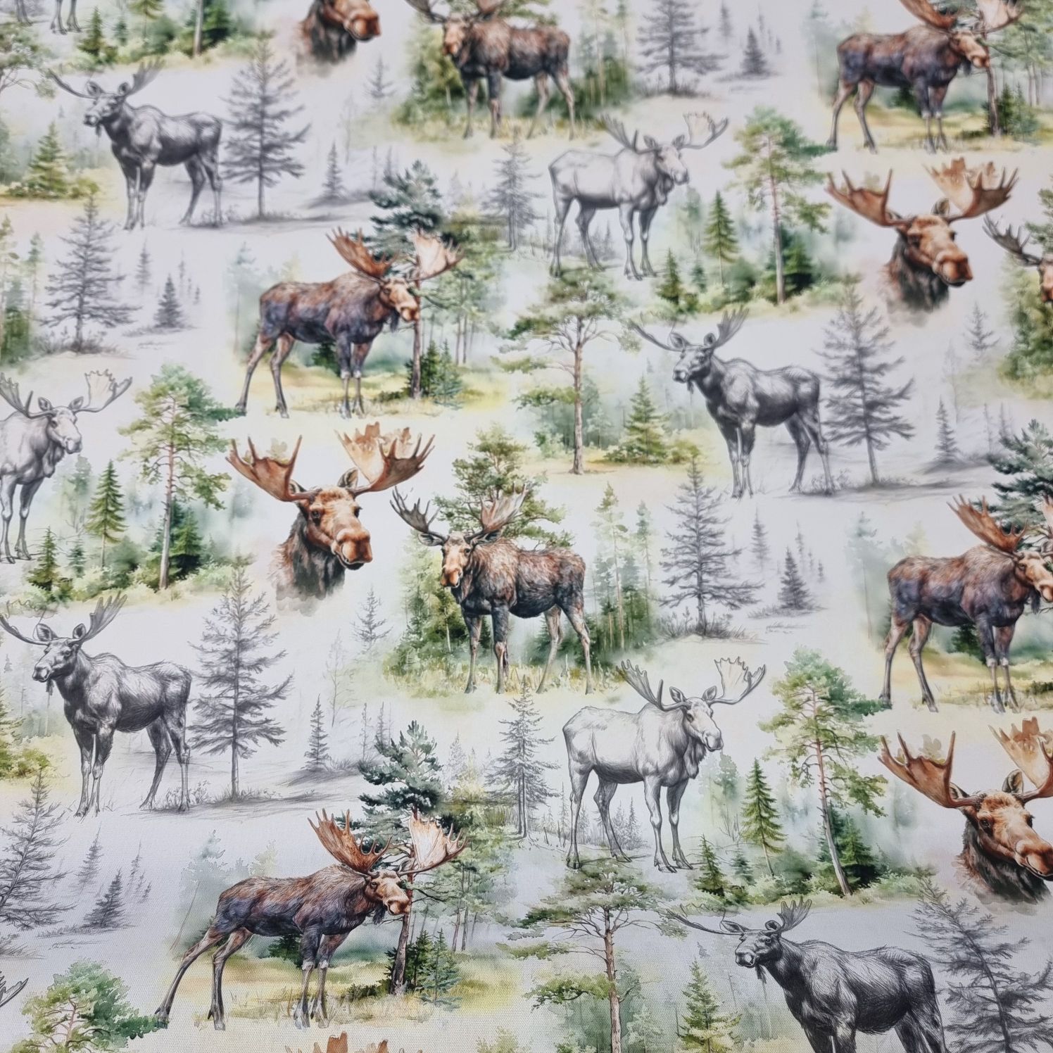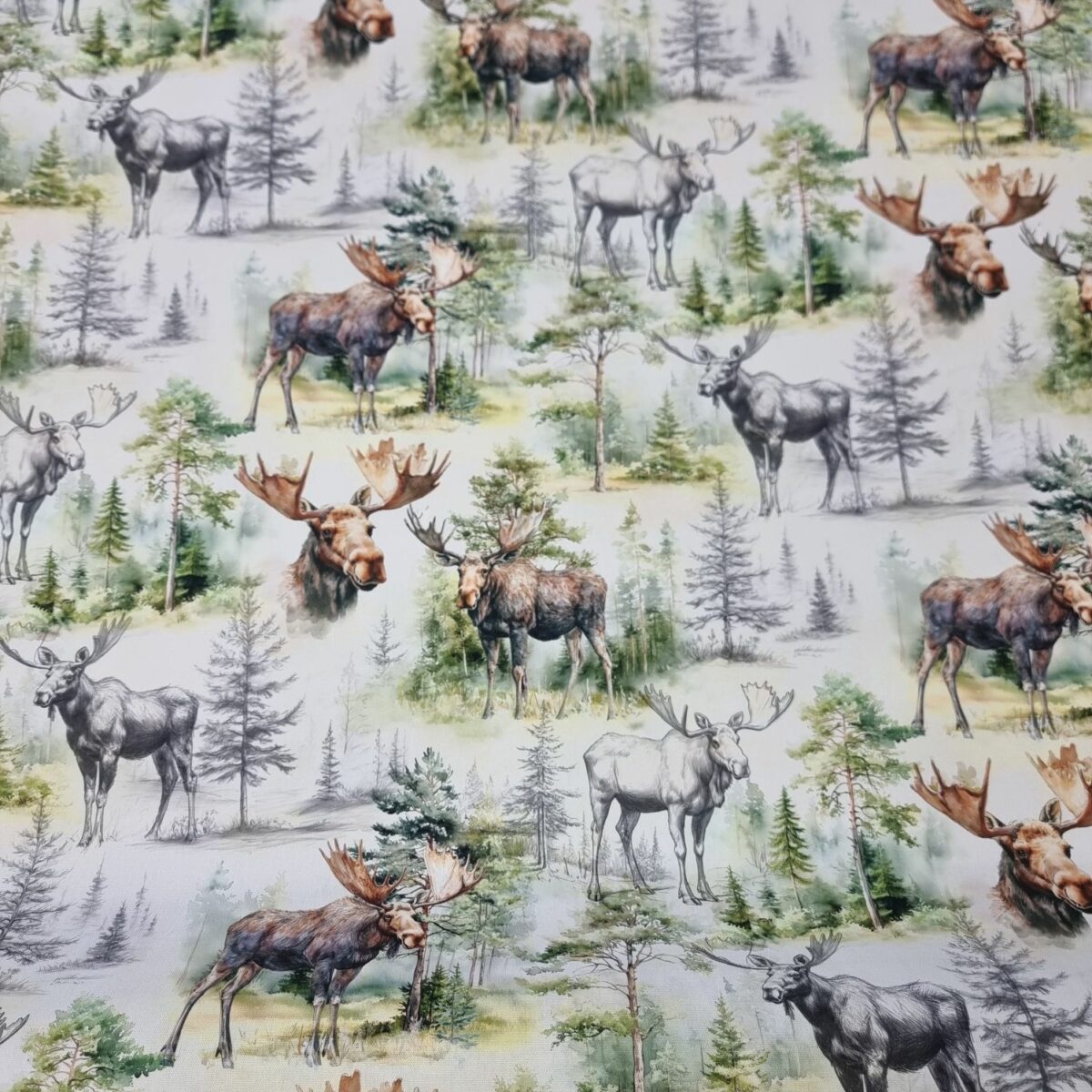 Äntligen kan vi erbjuda ett tyg med älgar i nordiskt tema.