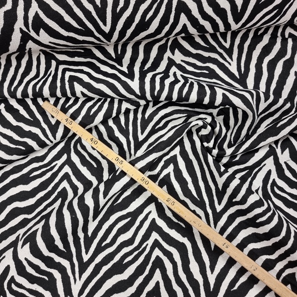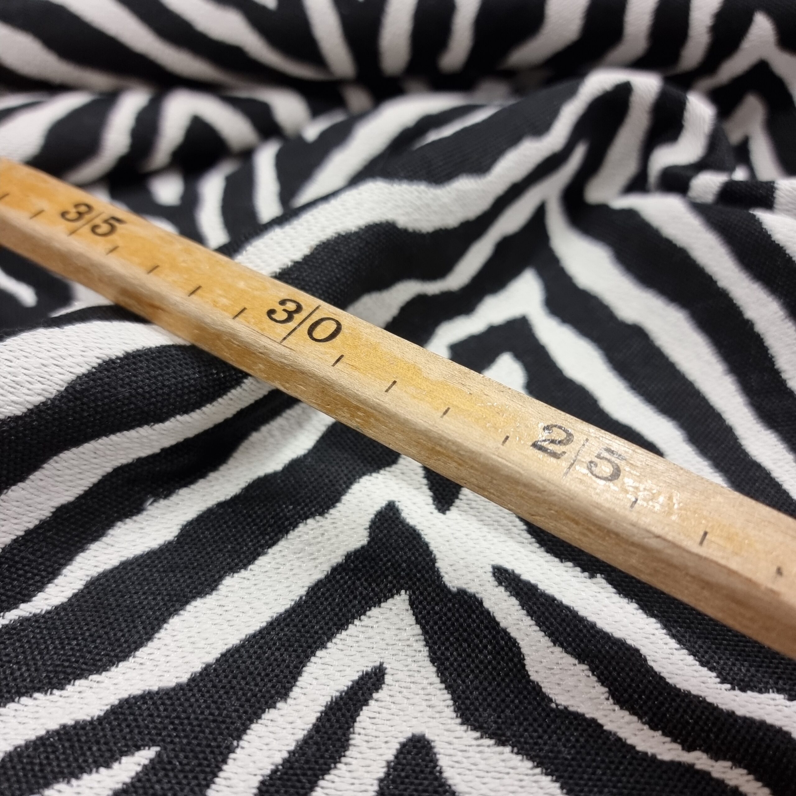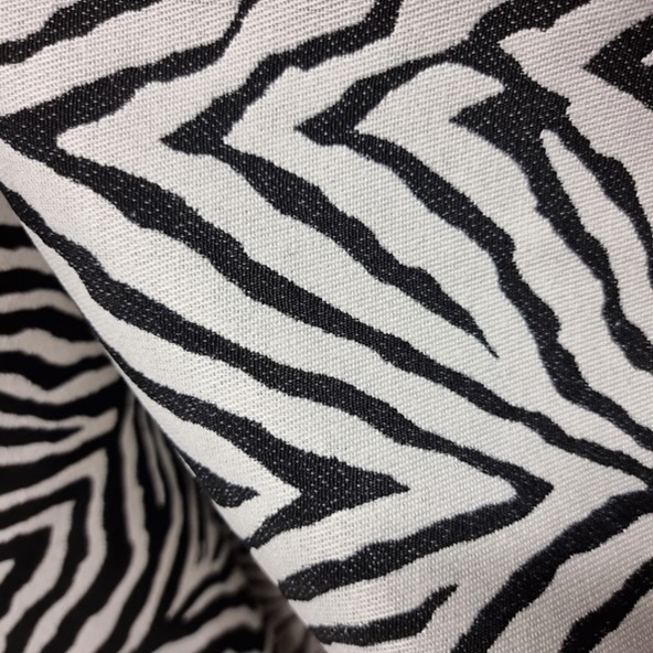 Klassiskt zebramönstrat, det blir ju aldrig fel. Här i form av ett jaquardvävt kraftigt tyg, med struktur, som verkligen hängt med genom tiderna (just detta är dock inte flera hundra år utan faktiskt helt nyproducerat). Passar perfekt till finsoffan, sypuffen, sänggaveln, shoppingkassen, den knasiga fåtöljen, pianopallen, draperiet, västen, kappan etc etc. Bara fråga oss om du blir osäker på om den funkar till det du tänkt dig.