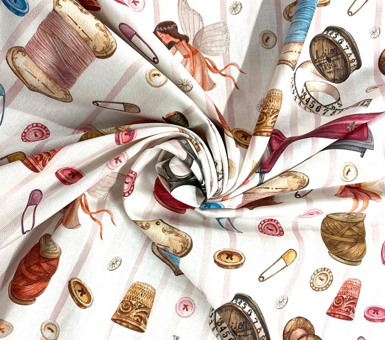 Synördar, se hit! Symaskiner, knappar och säkerhetsnålar m.m på ett tyg, kan det bli bättre? Dessutom med älvor som bonus. Vit botten med lodräta rosa ränder finns bakom dessa härliga motiv. Tryckt på en lite kraftigare bomullsväv, som lämpar sig till kuddar, gardiner, dukar, klä om stolsdynor, kassar, väskor etc.
