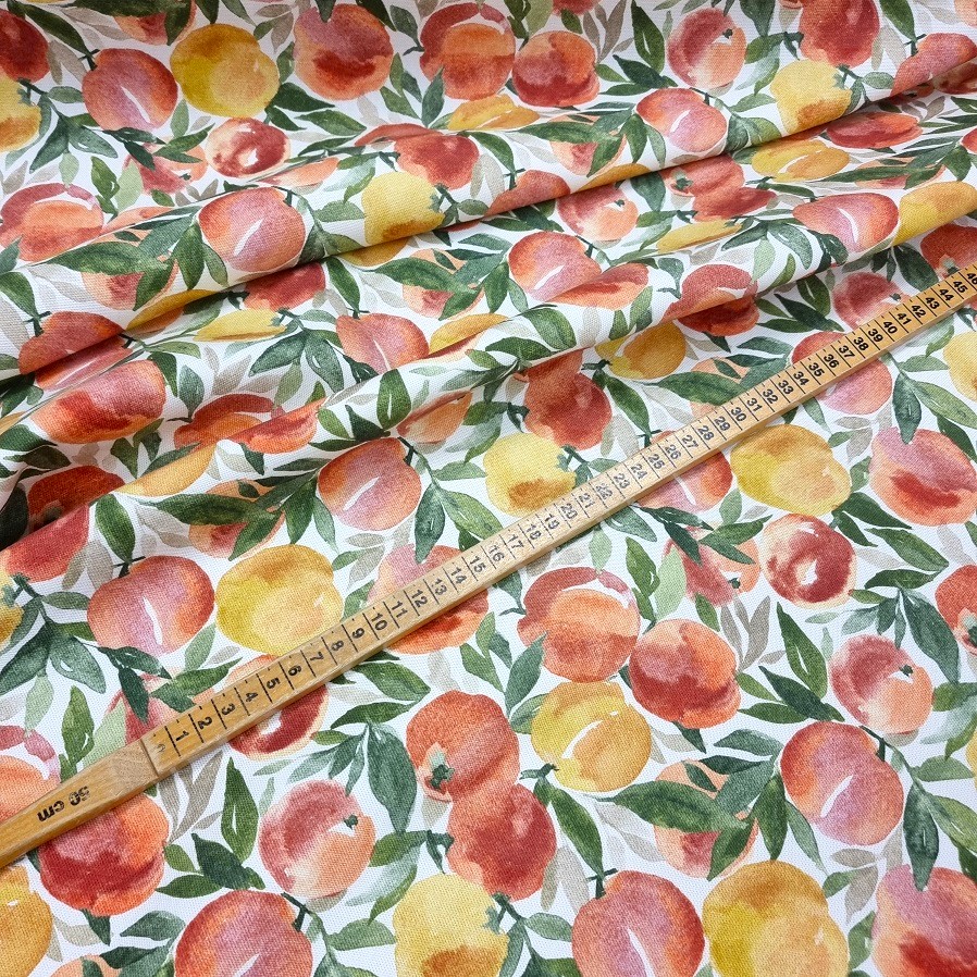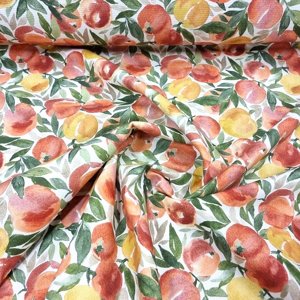 Äpplet, vad du är fin. Här i milda, varma toner som känns lite som en kram. Tryckta på en halvkraftig väv, lämplig till kuddar, gardiner, dukar, förkläden etc.