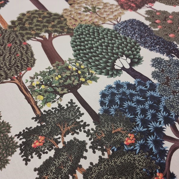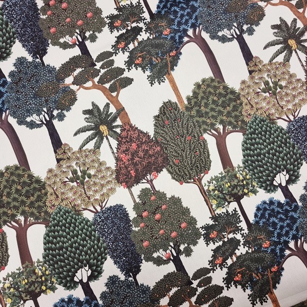 En sagornas skog fångad i en väv. Det är som att stå framför en vacker målning på ett museum. Så många detaljer, så många färger. Helt fascinerande. En kraftig bomullsväv, som lämpar sig till kuddar, gardiner, dukar, klä om stolsdynor, kassar, väskor, dynor, byxor etc.