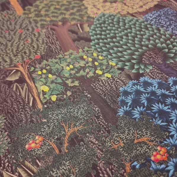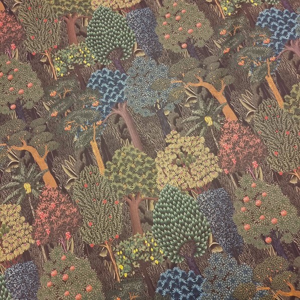 En sagornas skog fångad i en väv. Det är som att stå framför en vacker målning på ett museum. Så många detaljer, så många färger. Helt fascinerande. En kraftig bomullsväv, som lämpar sig till kuddar, gardiner, dukar, klä om stolsdynor, kassar, väskor, dynor, byxor etc.