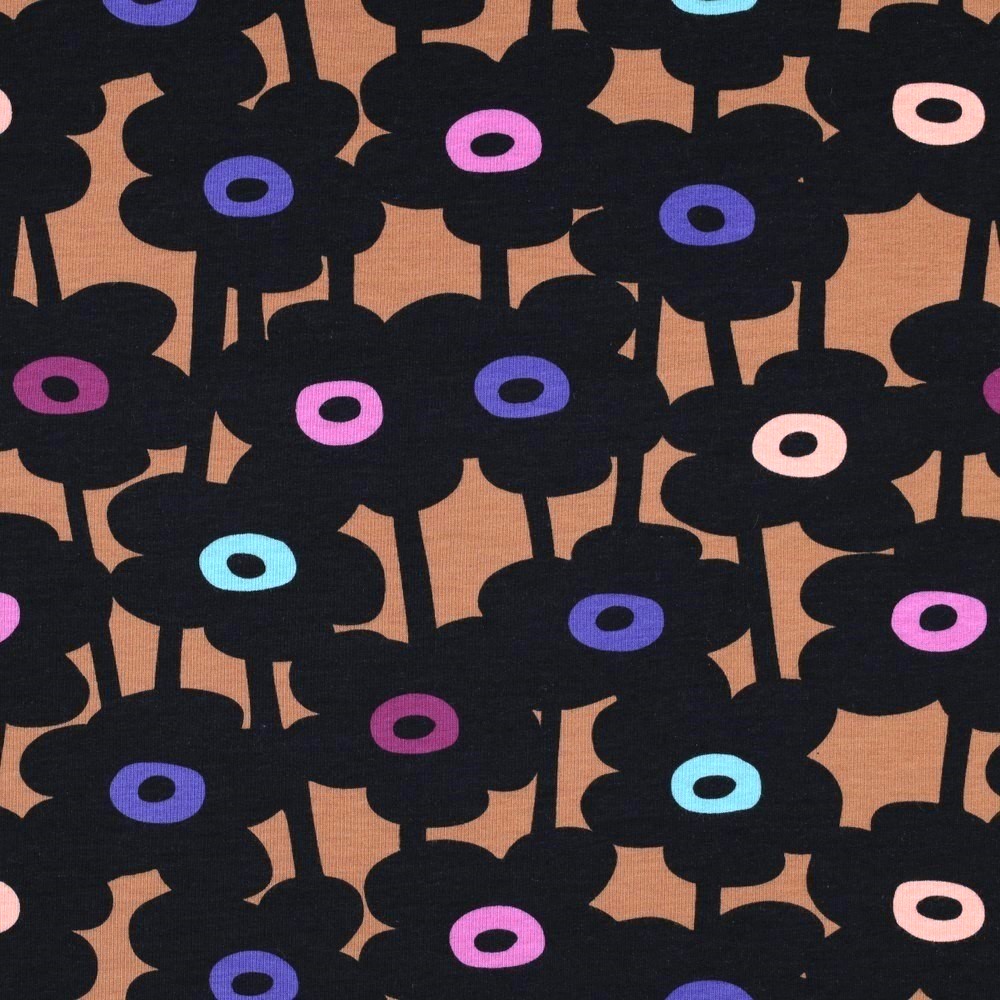Oj, oj, oj, vänta lite nu. Vad händer här? Som ett fantastiskt färgbad och dessutom i en riktigt skön jogging med flossad baksida. Enkla grafiska blommor (ca 10cm) i färger som gör en alldeles sprallig av lycka. Hade kunnat vara designat av ett visst finsk märke, men är det inte, utan av den fantastiska Nerida Hansen. Passar alldeles strålande till allt från mysbyxor till tröjor, klänningar, byxor och hoodies etc.