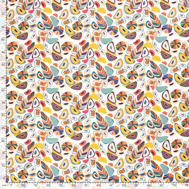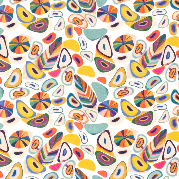 Seriöst hög mysfaktor plus att det är färgglatt tidlöst i sin design. Bra helt enkelt. Största figuren är 10cm. En riktigt mjuk och följsam jogging med flossad baksida och lite fall. Gör sig allra bäst i form av sköna avslappnade plagg. Tänk dig en lite oversize tröja och ett par skjorts; sommargarderoben är klar!