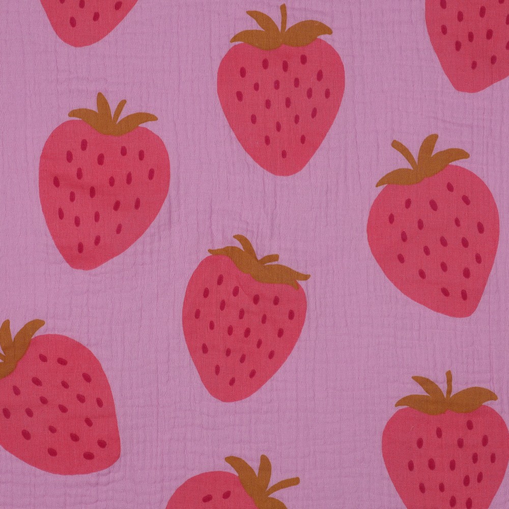 Mycket mysigare än muslin blir det nog inte och somrigare blir det nog inte heller! Jordgubbarna är ca 10cm. Ett dubbelvävt, otroligt behagligt bomullstyg med en liten skrynklig struktur. Passar ypperligt till klänningar, bebisfiltar/snuttar, blusar, skjortor, vida sommarbyxor etc.