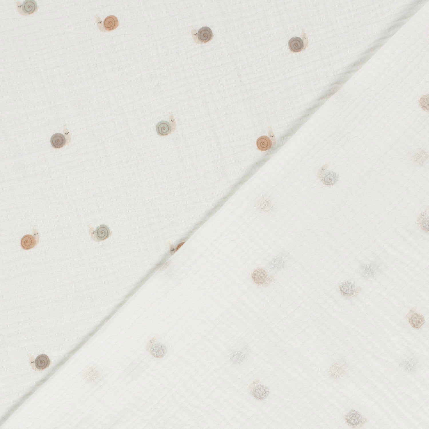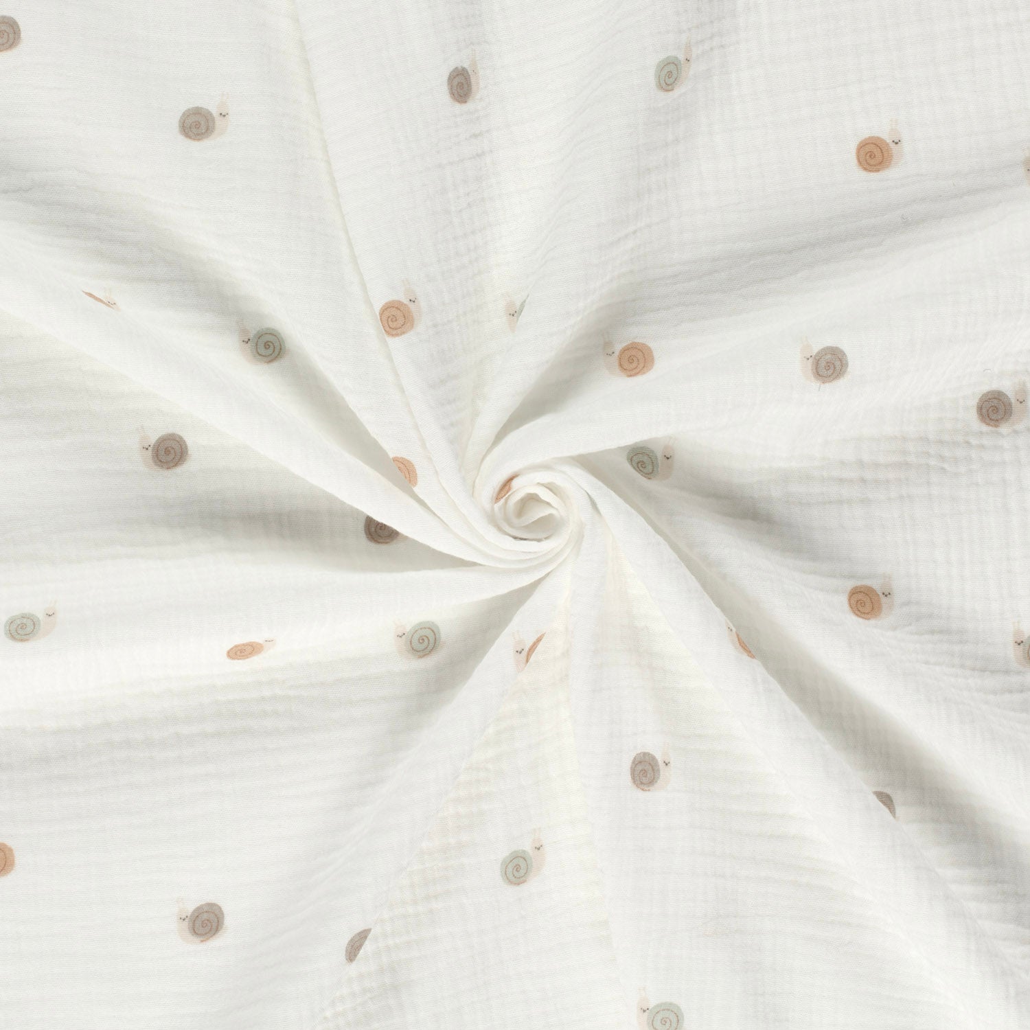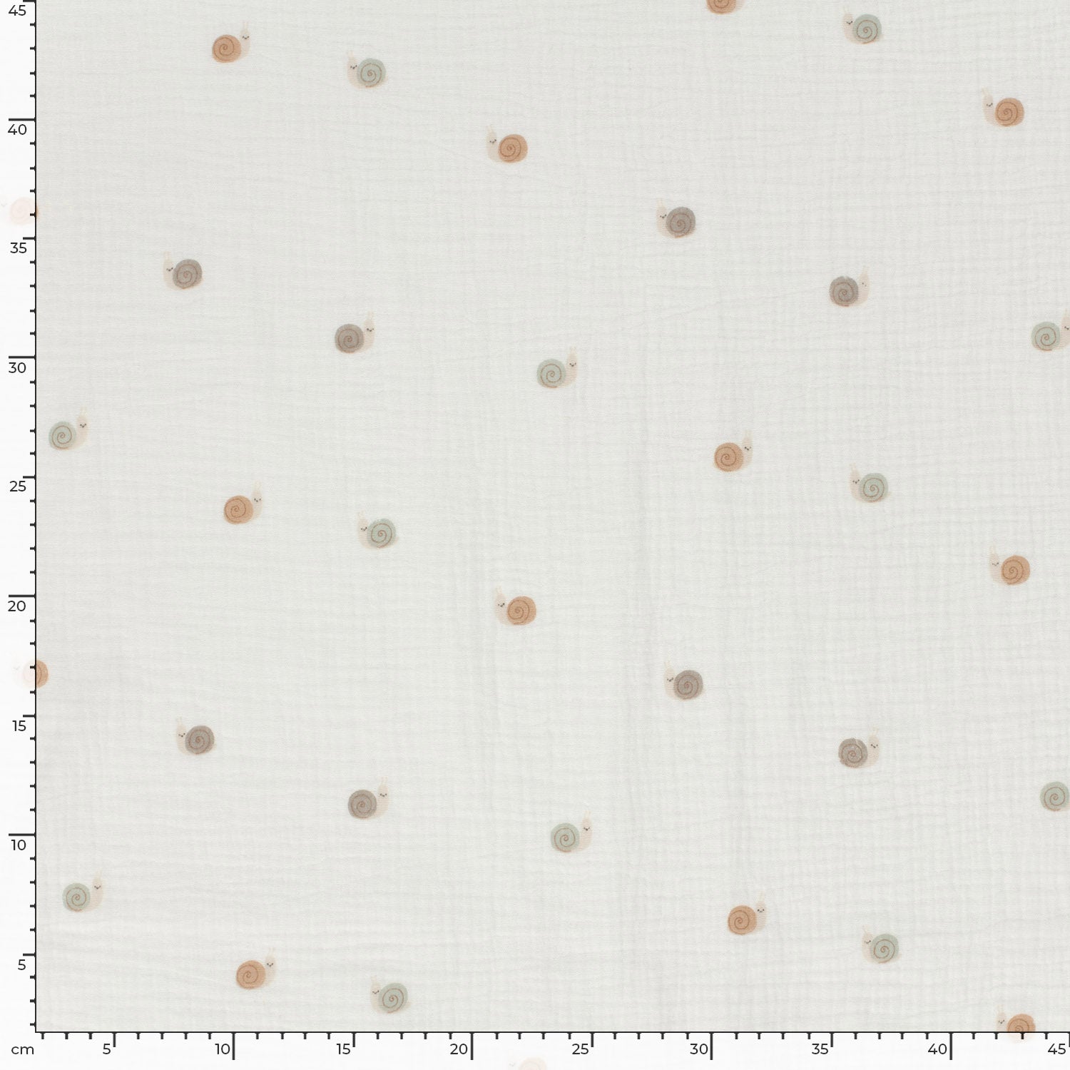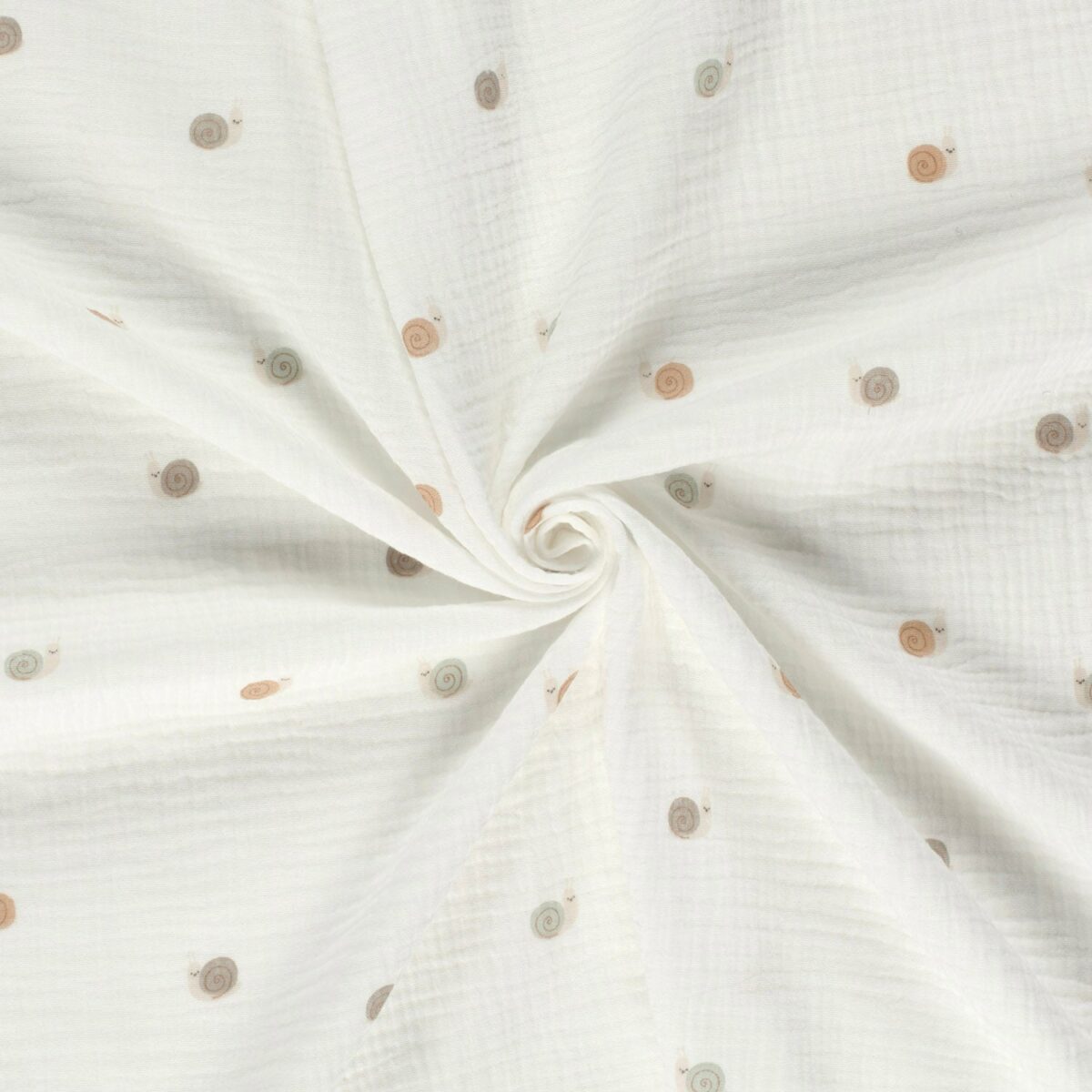 Mycket mysigare än muslin blir det nog inte och somrigare blir det nog inte heller! Dessa fina små sniglar är ca 2cm stora. Ett dubbelvävt, otroligt behagligt bomullstyg med en liten skrynklig struktur. Passar ypperligt till klänningar, bebisfiltar/snuttar, blusar, skjortor, vida sommarbyxor etc.