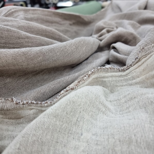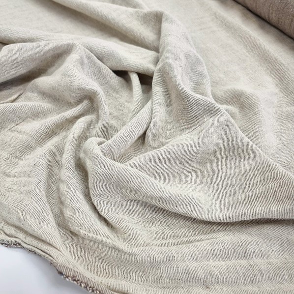 Oj, wow, det här är något utöver det extra. Vi snackar en dubbelvävd, otroligt behaglig muslin med lite mer kropp och lite mer tyngd än vad man är van vid. Ena sidan är naturvit med en lite grövre och vacker struktur, som utan tvekan gör denna väv tvåsidig. Passar ypperligt till duk, gardin, himmelssäng, bebisfiltar/snuttar, skjortor etc.