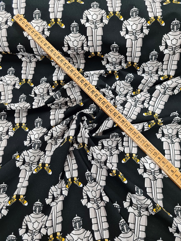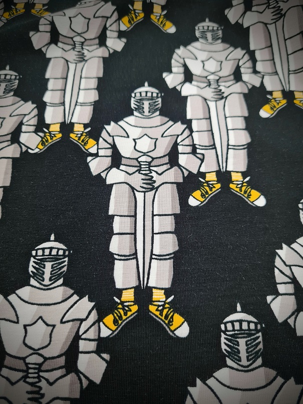 Svensk design när den är som knasigast. Tänk vad annorlunda det hade kunnat varit på riddarnas tid om de hade kunnat få ha lite roliga strumpor på fötterna. Ett joggingtyg med öglad baksida som gör sig oerhört bra till byxor, klänningar, hoodies etc. Det är mjukt, följsamt och framförallt väldigt bekvämt.