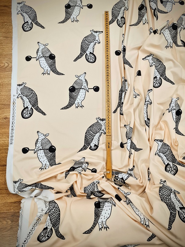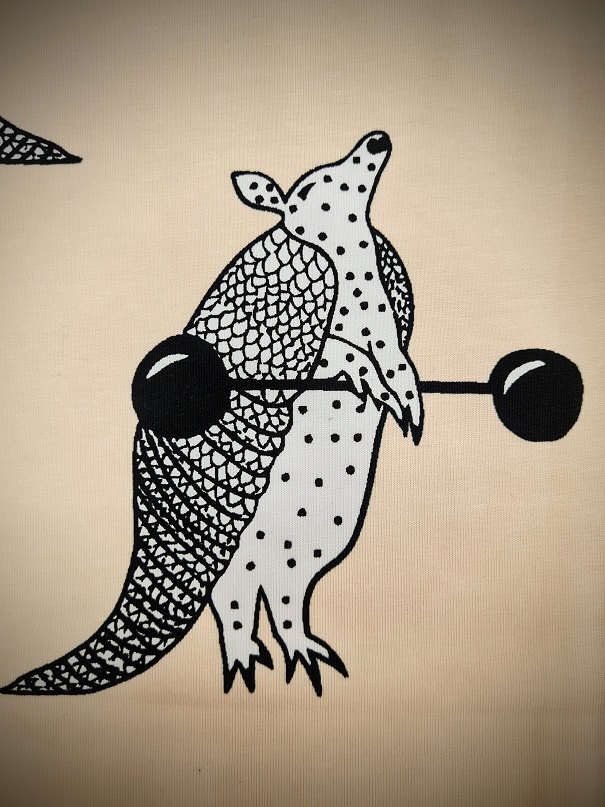 Svensk design när den är som knasigast. Klart att en måste ha en t-shirt med ett bältdjur som lyfter skrot. Ett trikåtyg i en typisk tights/t-shirt-kvalite, med en stretch som gör att det lämpar sig både till tightare och lösare plagg. Det är mjukt, följsamt och framförallt väldigt bekvämt.