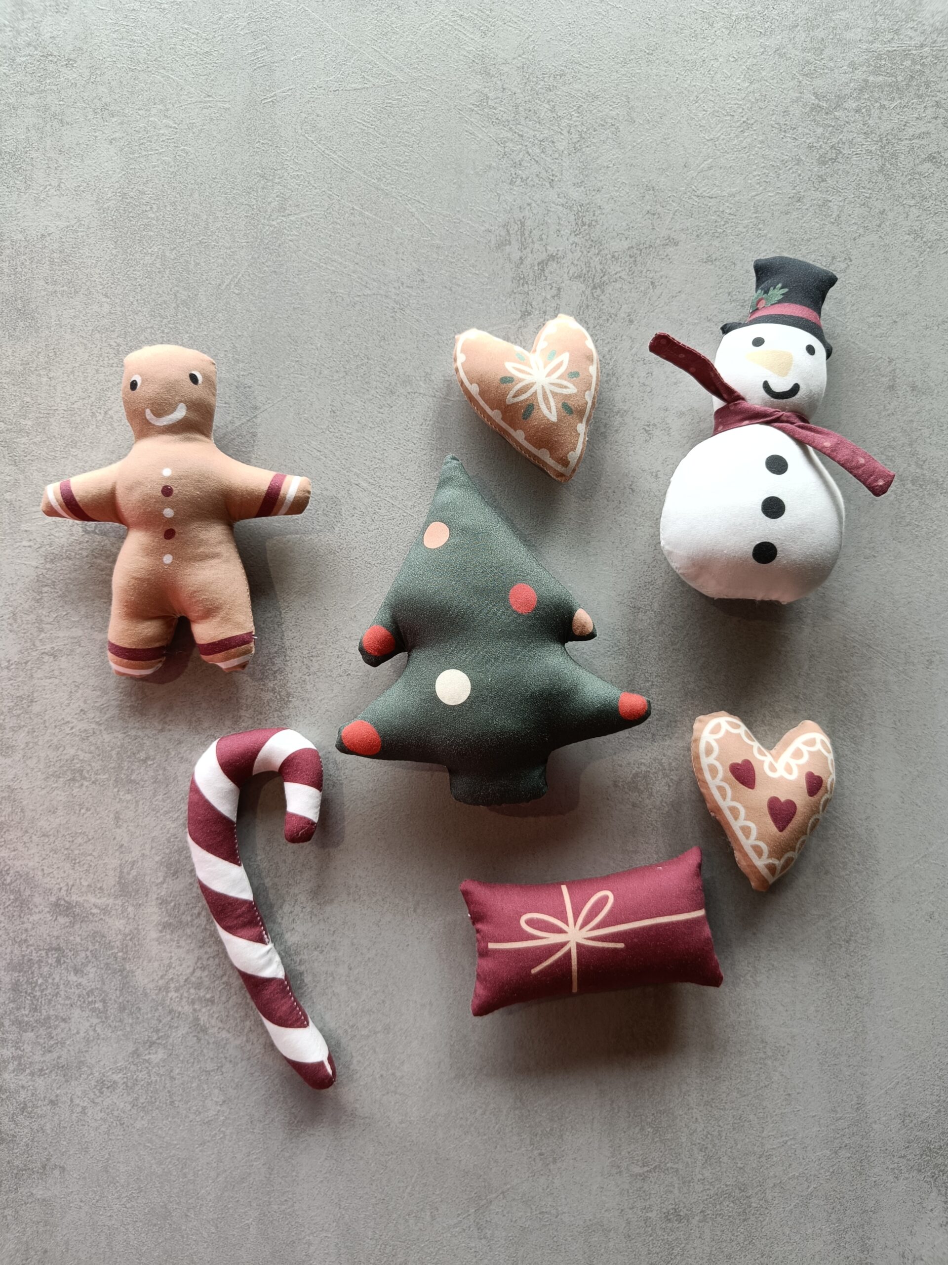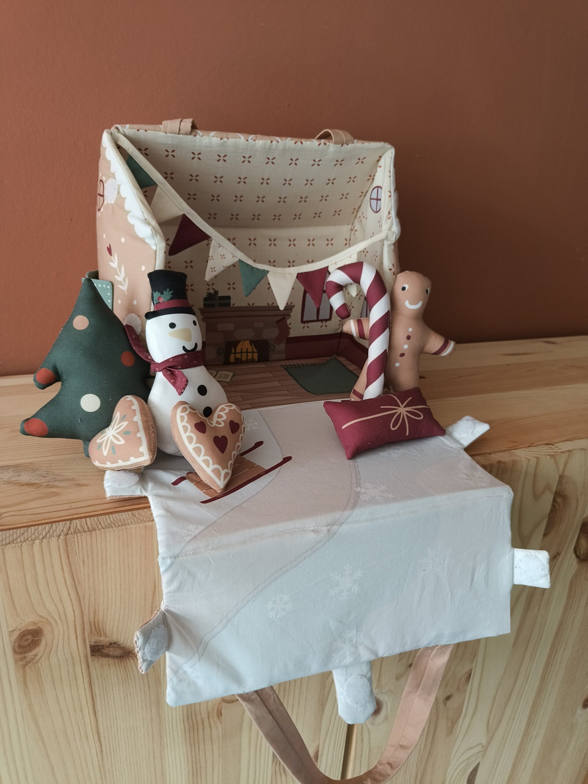 Visst känner man ibland starkt för att julpyssla, men orkar eller hinner inte med alla de där förberedelserna runtomkring? Då har du lösningen här! En panel (alltså ett stycke tyg, på 98 cm x 148 cm i det här fallet) med tryckta mönsterdelar för att göra ett mjukt litet dockhus i pepparkaksstil. En pepparkaksgubbe och en snögubbe följer med och vill gärna flytta in, tillsammans med dekorationer av olika slag.