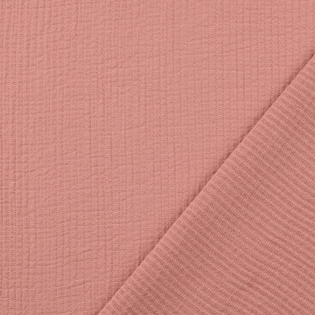 Oj, wow, det här är något utöver det extra. Vi snackar en tvåsidig, tunnt quiltad, otroligt behaglig muslin med mer kropp och tyngd än vad man först kan tro. Ena sidan är har en lite grövre och vacker struktur och andra sidan har vackra jämna quiltade ränder med ca 5mm mellanrum. Passar ypperligt till duk, gardin, morgonrock, byxor, skjorta etc.