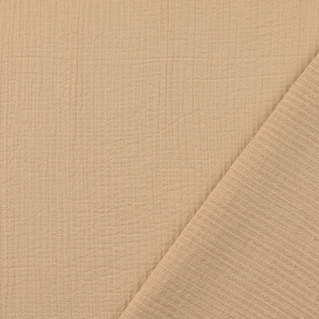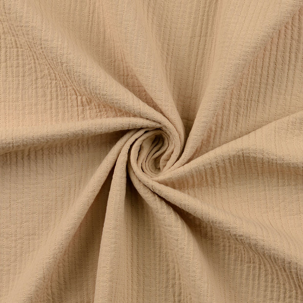 Oj, wow, det här är något utöver det extra. Vi snackar en tvåsidig, tunnt quiltad, otroligt behaglig muslin med mer kropp och tyngd än vad man först kan tro. Ena sidan är har en lite grövre och vacker struktur och andra sidan har vackra jämna quiltade ränder med ca 5mm mellanrum. Passar ypperligt till duk, gardin, morgonrock, byxor, skjorta etc.