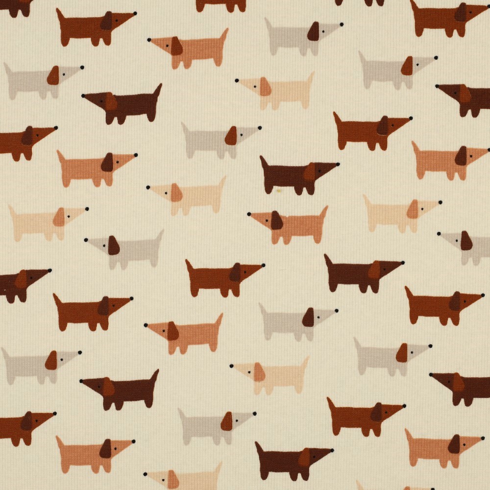 Ett ribbstickat tyg i mjuka varma toner med tydlig ribbning både på rätsidan och på avigsidan. De lite lagom förvirrade hundarna är ca 5cm långa. Tänk dig den där komma-hem-efter-jobbet-krypa-in-i-gos-tröjan/klänningen? Ja! Eller babyfilten, lilla koftan, bodyn etc.
