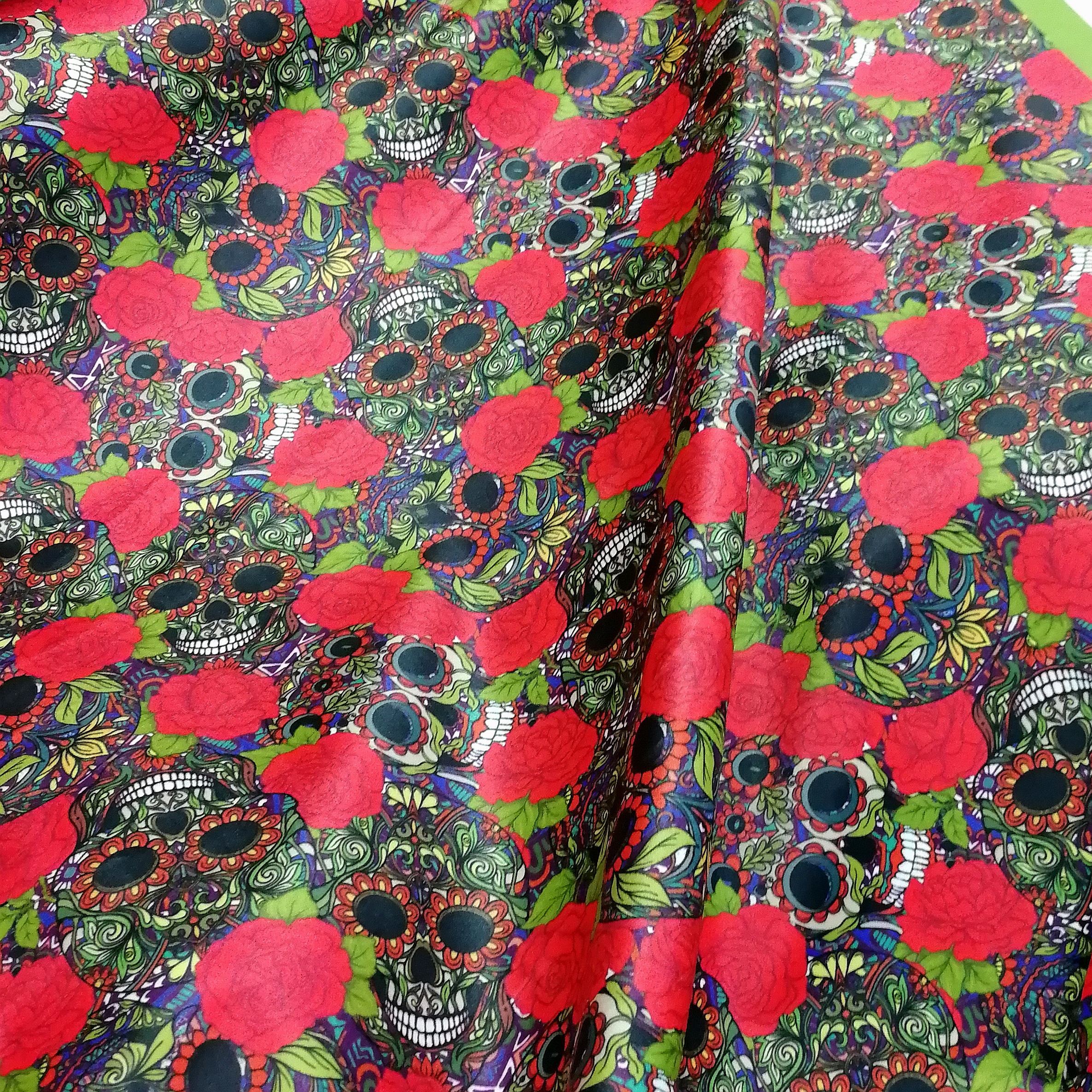 [vc_row][vc_column][vc_column_text text_larger=”no”]För tusan, här var det döskallar, rosor och härliga färger! Det är en polyestersammet med ett riktigt tungt och fint fall, som passar göör bra till att klä om stolar eller möbler som inte används till så mycket mer än ögongodis eller varför inte gardiner, kuddar, väskor, puffar, sänggavlar etc.[/vc_column_text][/vc_column][/vc_row]