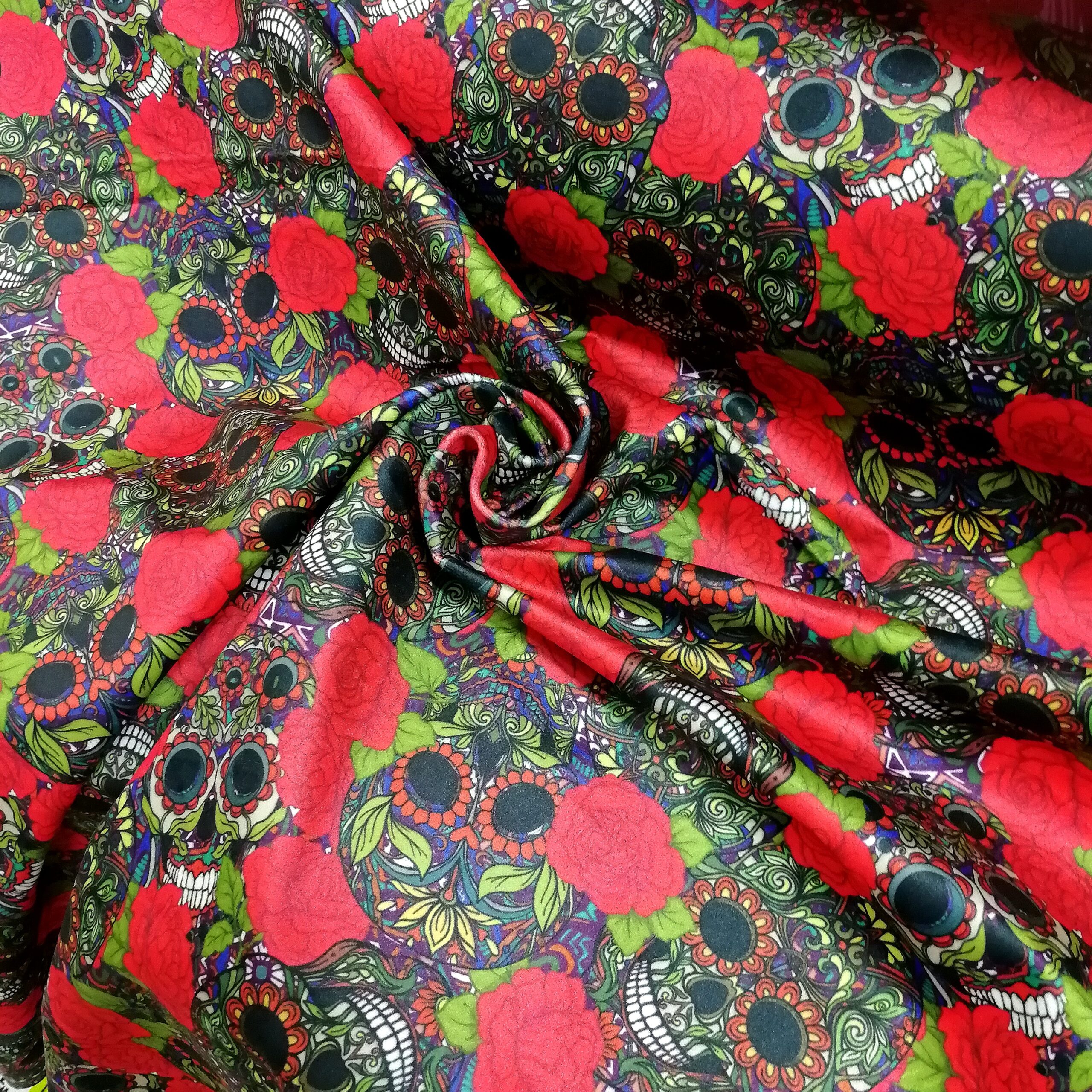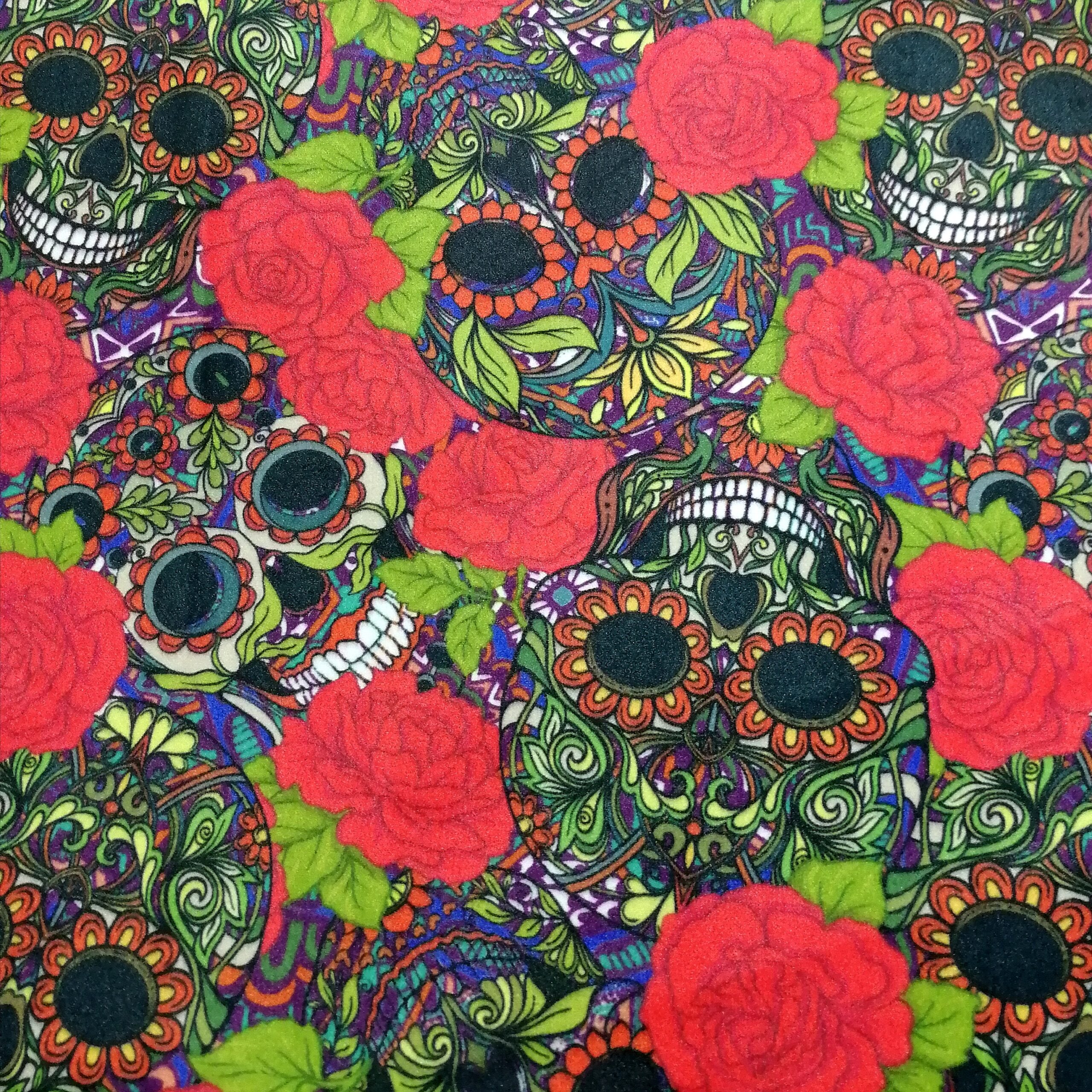 [vc_row][vc_column][vc_column_text text_larger=”no”]För tusan, här var det döskallar, rosor och härliga färger! Det är en polyestersammet med ett riktigt tungt och fint fall, som passar göör bra till att klä om stolar eller möbler som inte används till så mycket mer än ögongodis eller varför inte gardiner, kuddar, väskor, puffar, sänggavlar etc.[/vc_column_text][/vc_column][/vc_row]