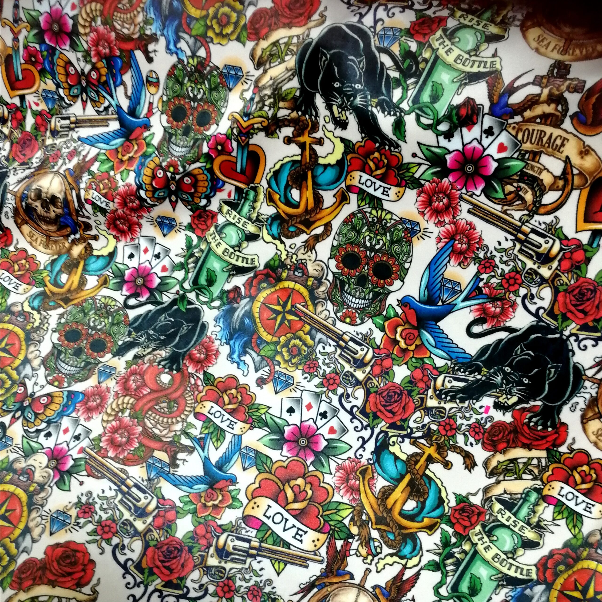 [vc_row][vc_column][vc_column_text text_larger=”no”]Oj. Är nog det första man tänker när man ser detta. För tusan, vilken grej! Det är en polyestersammet med en mängd riktigt klassiska tatueringsmotiv. Tyget har en tungt och fint fall och passar göör bra till att klä om stolar eller möbler som inte används till så mycket mer än ögongodis eller varför inte gardiner, kuddar, väskor, puffar, sänggavlar etc.[/vc_column_text][/vc_column][/vc_row]