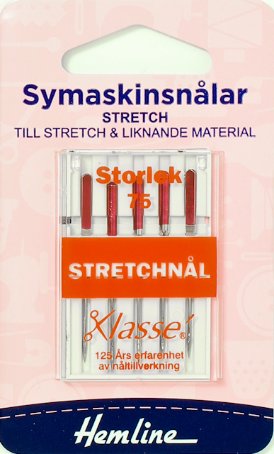 Symaskinsnål stretch 5-pack. Ska du sy i trikåtyg, alltså ett stickat, stretchigt lite tunnare tyg, ja, då är det här nålen för dig.