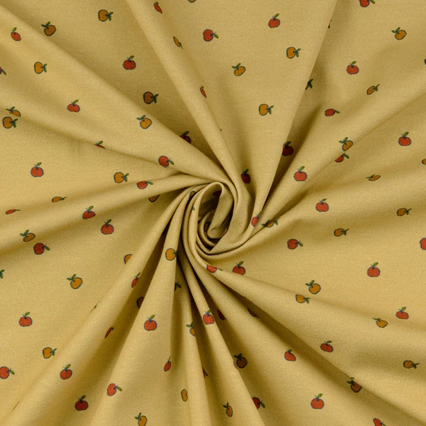 Här har någon varit ute i trädgården och skördat. Äpplena är runt 0,5cm. Färgerna är mjuka, milda och minner lite om förr. Du vet den romantiska tiden förr. Ett trikåtyg i en typisk tights/t-shirt-kvalité, med en stretch som gör att det lämpar sig både till tightare och lösare plagg. Det är mjukt, följsamt och framförallt väldigt bekvämt.