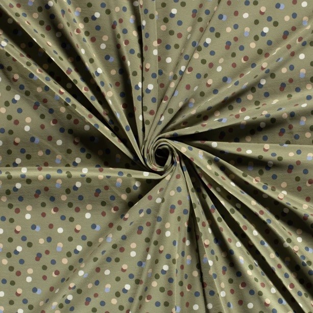 Här var det mysiga prickar (ca 1cm) lite huller om buller. Ett trikåtyg i en typisk tights/t-shirt-kvalité, med en stretch som gör att det lämpar sig både till tightare och lösare plagg. Det är mjukt, följsamt och framförallt väldigt bekvämt.