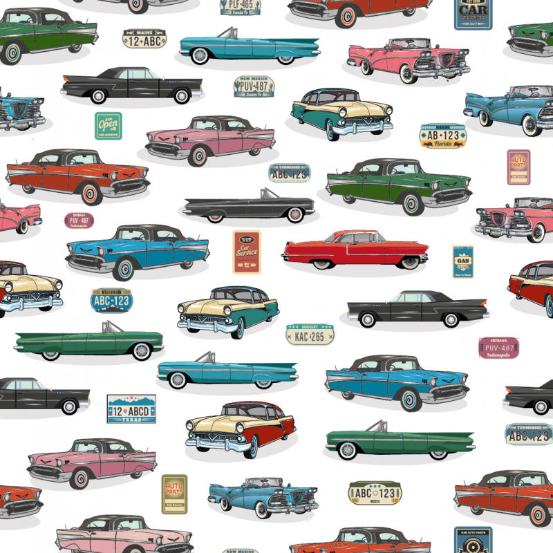 Alltså 50-talet ringde! Här var det vackra gamla bilar i bulliga former och härliga färger. Längsta bilen är strax över 5cm. Digitaltryckt bomullstrikå av hög kvalitet. Passar bra till klädsömnad mm. Tänk dig ett par kallingar eller en tischa![/vc_column_text][/vc_column][/vc_row]