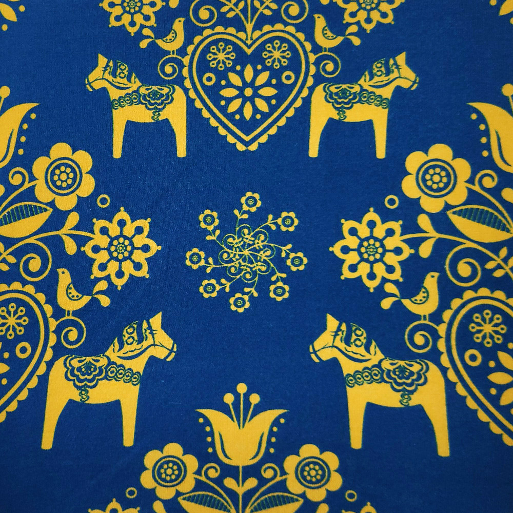 Här var det klassiskt dalamotiv i Sveriges fina färger. Hjärtat är ca 5cm högt. Digitaltryckt och ekologisk bomullstrikå av hög kvalitet. Passar bra till klädsömnad mm.