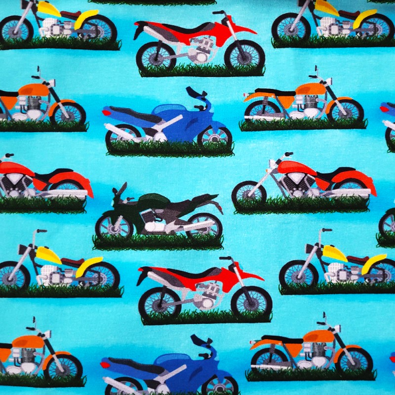 Är det motorcyklar eller är det mopeder? Kanske vet du eller känner någon som vet. I vilket fall som helst, så är dessa klassiska motorfordonen strax över 10cm. Ett trikåtyg i en typisk tights/t-shirt-kvalite, med en stretch som gör att det lämpar sig både till tightare och lösare plagg. Det är mjukt, följsamt och framförallt väldigt bekvämt.[/vc_column_text][/vc_column][/vc_row]