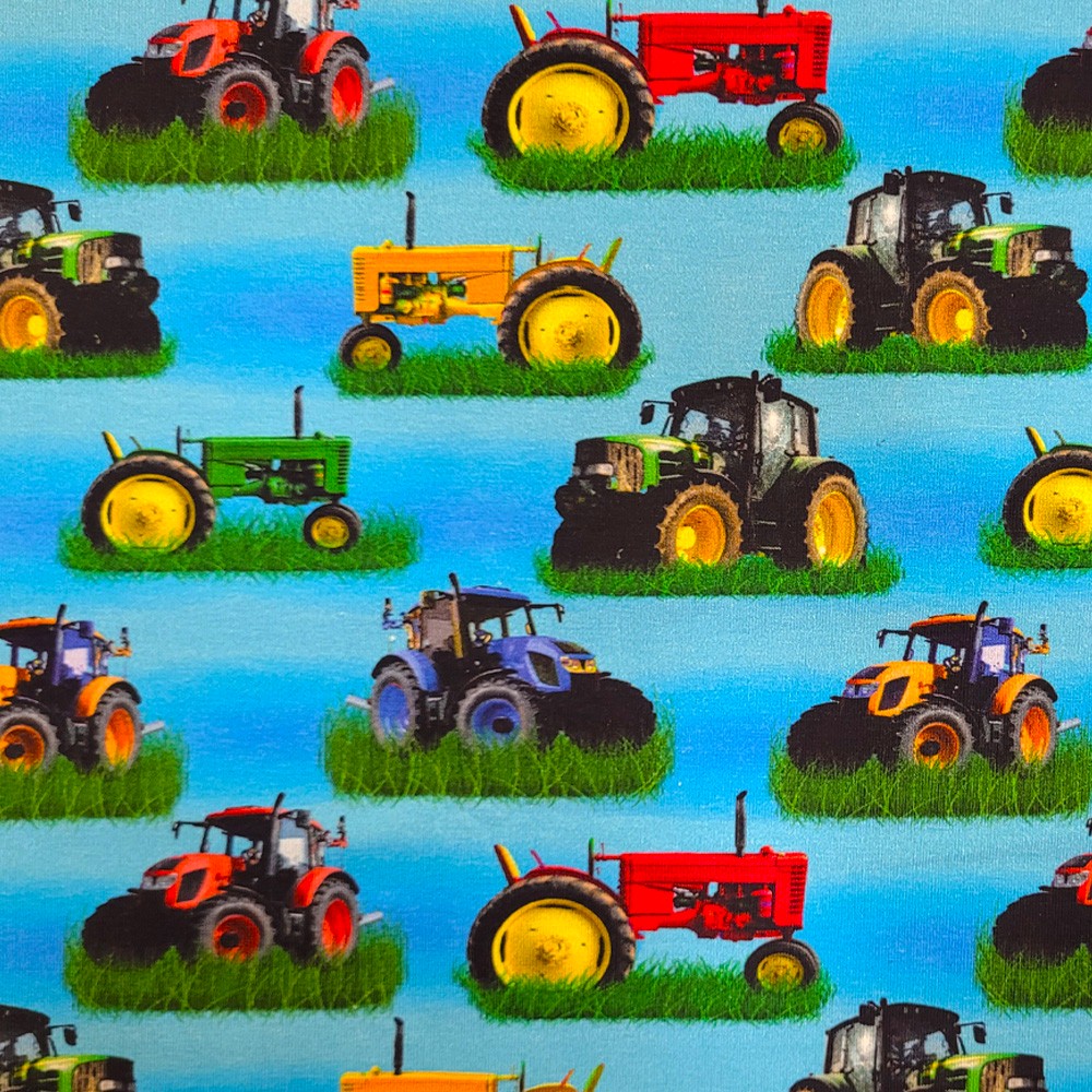 Trikå med multifärgade traktorer.
