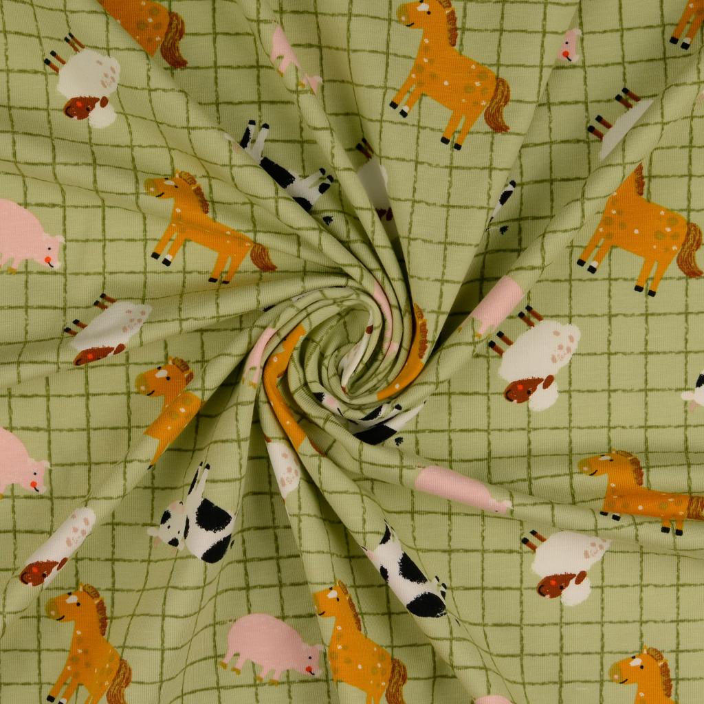 Nöff, muu, bääh och ett fasligt gnäggande. De är aldrig tysta det här gänget. Hästen mäter ca 5cm. Trikåtyg i en typisk tights/t-shirt-kvalite, med en stretch som gör att det lämpar sig både till tightare och lösare plagg. Det är mjukt, följsamt och framförallt väldigt bekvämt.