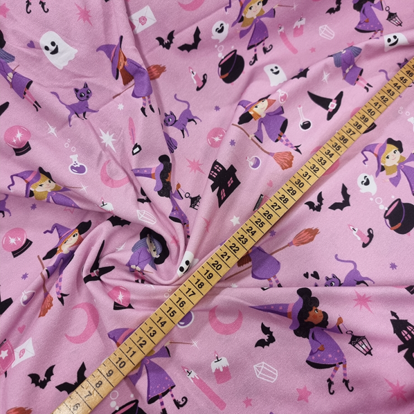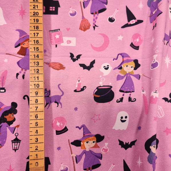 Det måste inte vara läskigt eller farligt för att räknas som halloween. Här har du kittlar, katter, häxor och spöken. Alla är snälla, även fladdermössen ser vänliga ut. Trikåtyg i en typisk tights/t-shirt-kvalité, med en stretch som gör att det lämpar sig både till tightare och lösare plagg. Det är mjukt, följsamt och framförallt väldigt bekvämt.