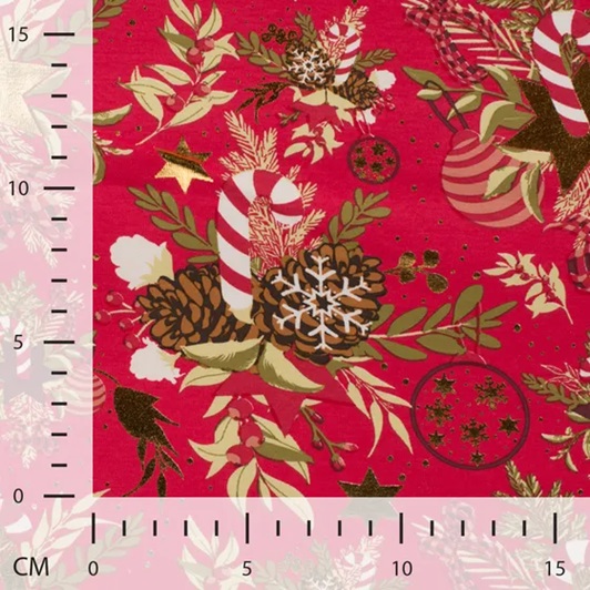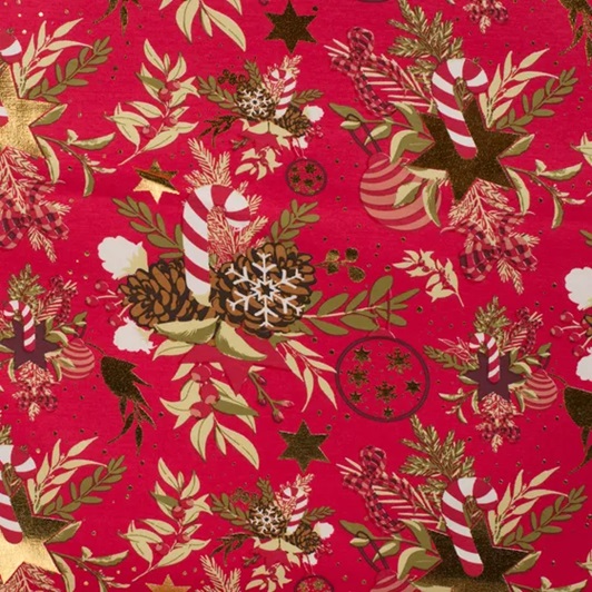 Här har du kottar, polkagrisar, guldstjärnor, rutiga band och dylikt. Minsta julkulan är 1,5cm. Ett trikåtyg i en typisk tights/t-shirt-kvalite, med en stretch som gör att det lämpar sig både till tightare och lösare plagg. Det är mjukt, följsamt och framförallt väldigt bekvämt.