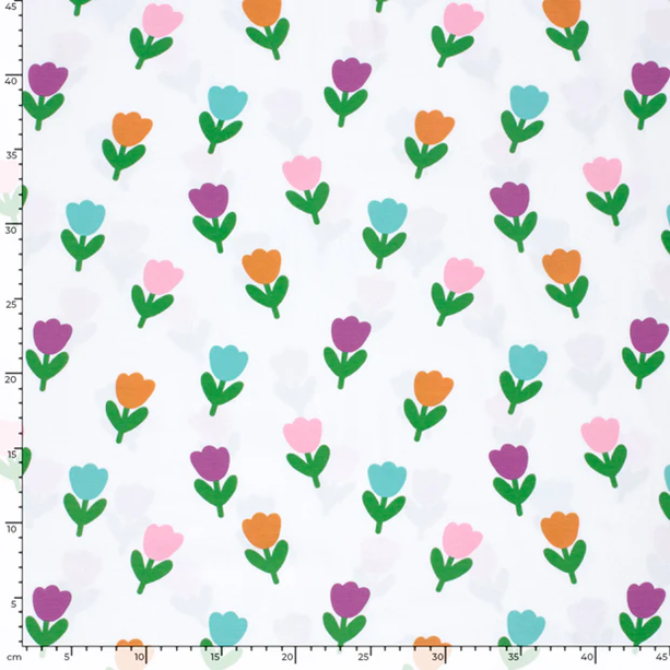 En blomma rakt upp och ner, utan pardon. Med massor av glädje och mod i sommarglada färger. Ett trikåtyg i en typisk tights/t-shirt-kvalité, med en stretch som gör att det lämpar sig både till tightare och lösare plagg. Det är mjukt, följsamt och framförallt väldigt bekvämt.