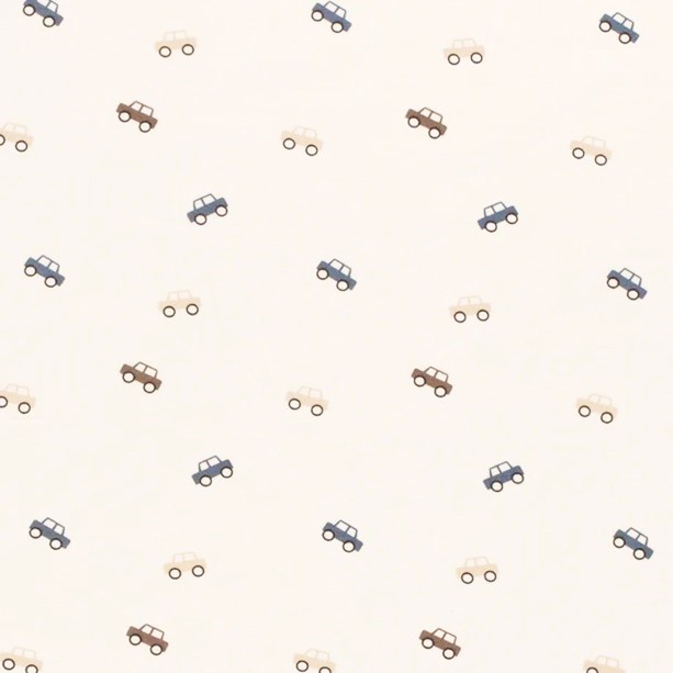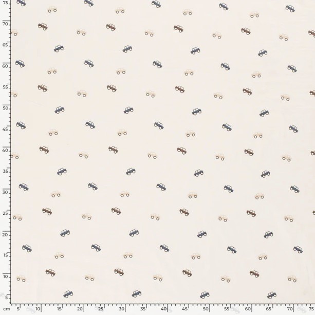 En liten enkel bil möter här världen och det blir nästan bedårande sött. Bilarna mäter ca 2cm. Ett trikåtyg i en typisk tights/t-shirt-kvalité, med en stretch som gör att det lämpar sig både till tightare och lösare plagg. Det är mjukt, följsamt och framförallt väldigt bekvämt.