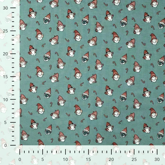 Mitt bland alla polkagrisstänger hittar du dessa små charmiga filurer. Svårt att se dem i ögonen eftersom luvan är lite stor och har åkt ner. Svårt också att veta om dessa tomtar har någon kropp där bakom skägget. Mystiska varelser helt enkelt. I vilket fall är varje liten nisse är ca 2,5cm hög. Ett trikåtyg i en typisk tights/t-shirt-kvalite, med en stretch som gör att det lämpar sig både till tightare och lösare plagg. Det är mjukt, följsamt och framförallt väldigt bekvämt.