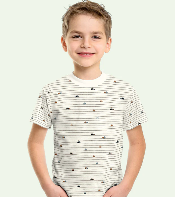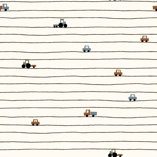 Enkla former och milda färger. Svårare än så behöver det inte vara. Traktorer, bilar och lastbilar. Minsta fordonet är knappt 1cm. Ett trikåtyg i en typisk tights/t-shirt-kvalité, med en stretch som gör att det lämpar sig både till tightare och lösare plagg. Det är mjukt, följsamt och framförallt väldigt bekvämt.